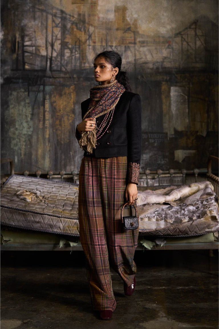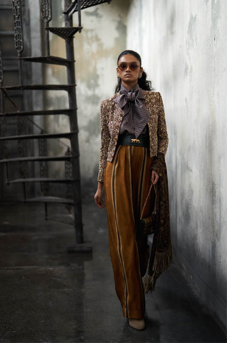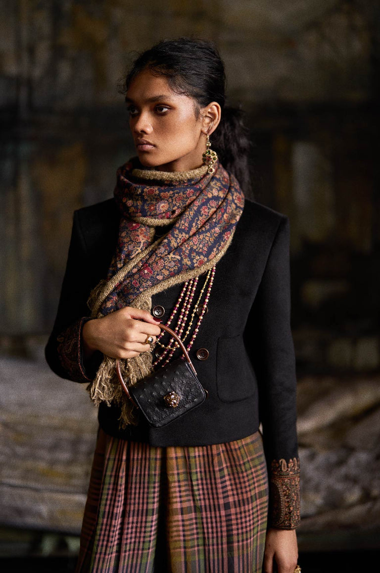 From the bylanes of Benaras and family-run factories in Prato, across the steppes of Mongolia and the high plateau of Peru, through the storied mills of Scotland to the ateliers of West Bengal, the Sabyasachi Autumn/Winter 2024 collection is a celebration of the finest textiles from around the globe. Adhering to the steadfast codes of couture, crafted on the foundations of classical menswear tailoring and interspersed with artisanal embroideries, Sabyasachi re-imagines ready-to-wear. Weaving haute techniques and the finest quality materials with the ease and wearability of contemporary styles, wardrobe staples are transformed into modern heirlooms.