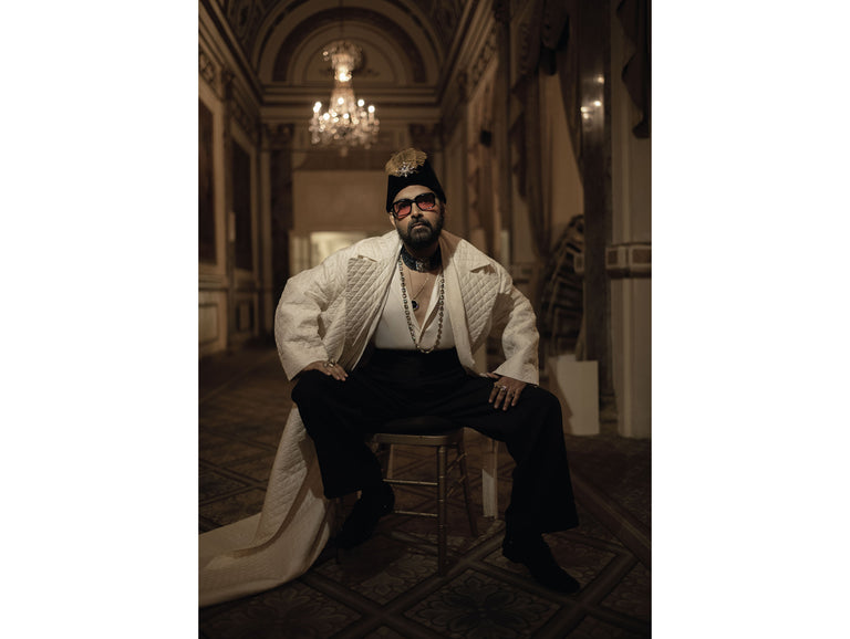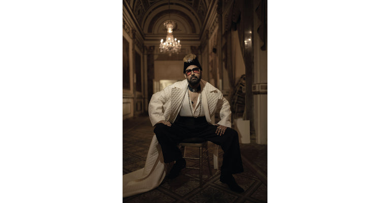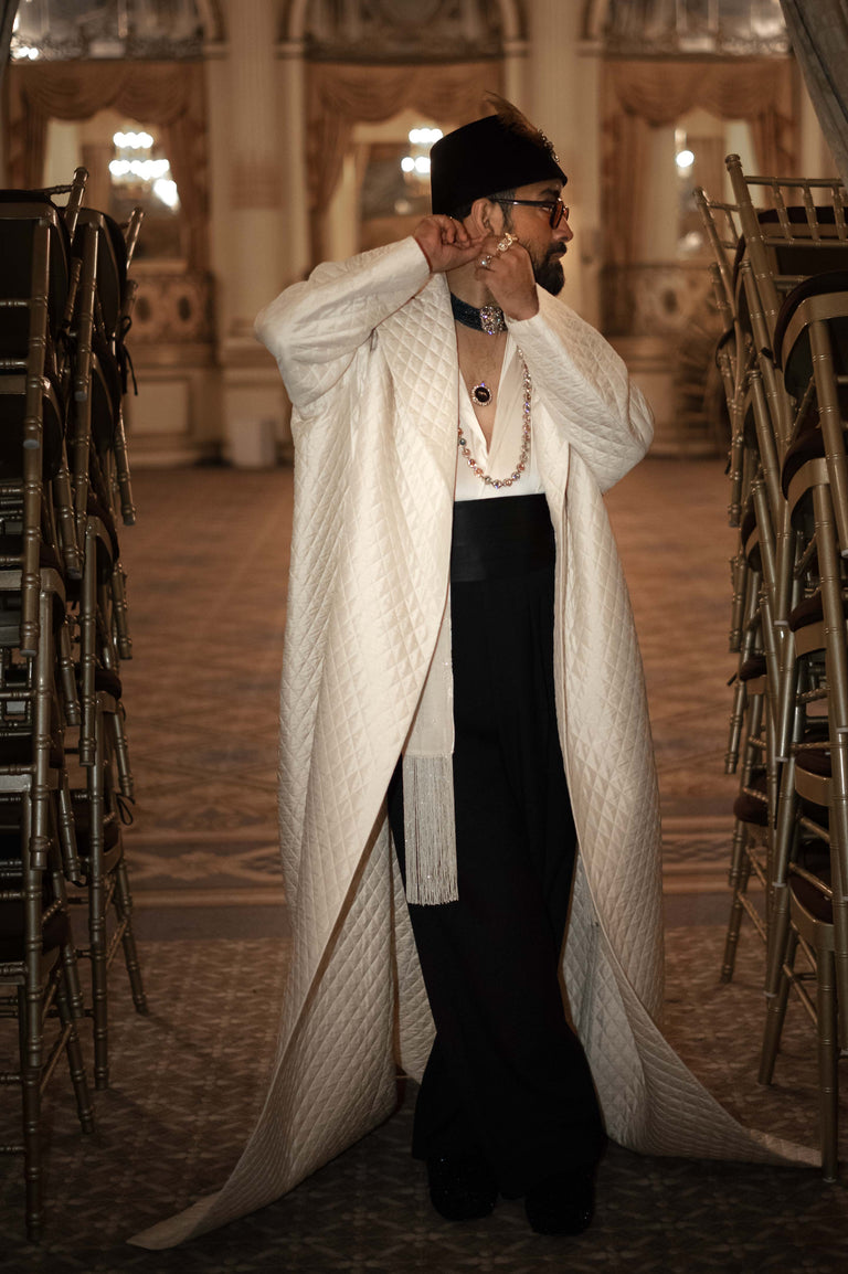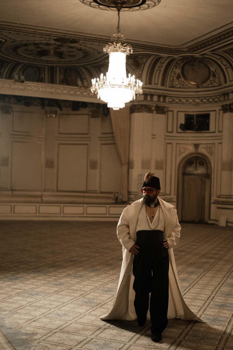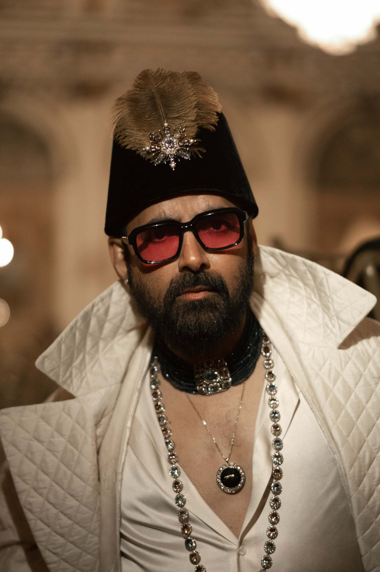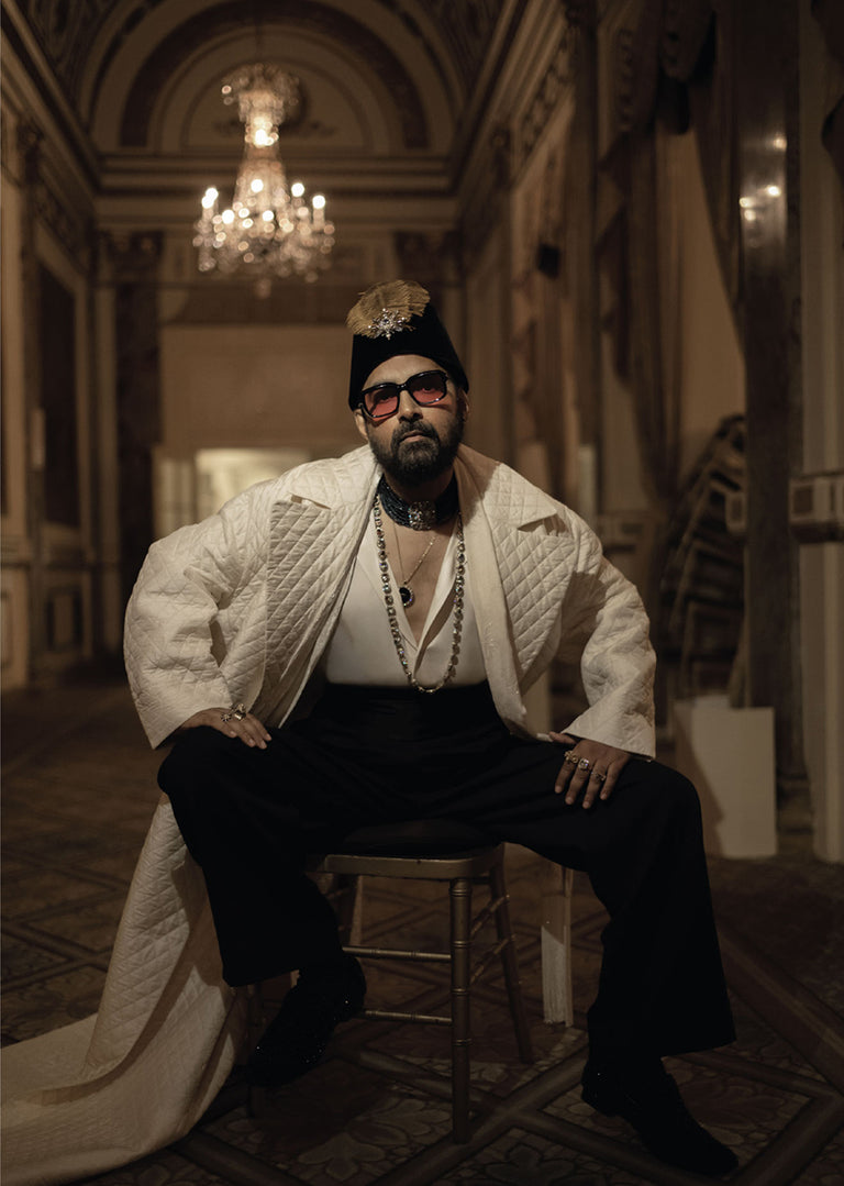 Sabyasachi’s inspiration of the Black Dandy originates with the noble houses of India. A hand quilted, oversized court jacket and sherwani in hand dyed Murshidabad silk paired with satin shirt, black quilted trousers and kamarbandh, styled with custom embroidered shoes by Sabyasachi Accessories. The look is completed with exquisite pieces from the Bengal Royale collection of Sabyasachi High Jewellery.