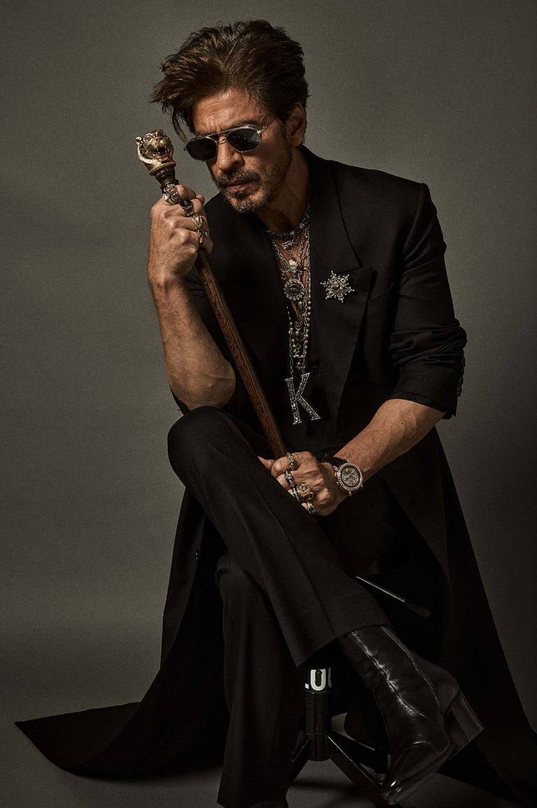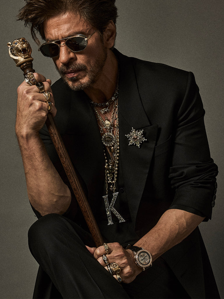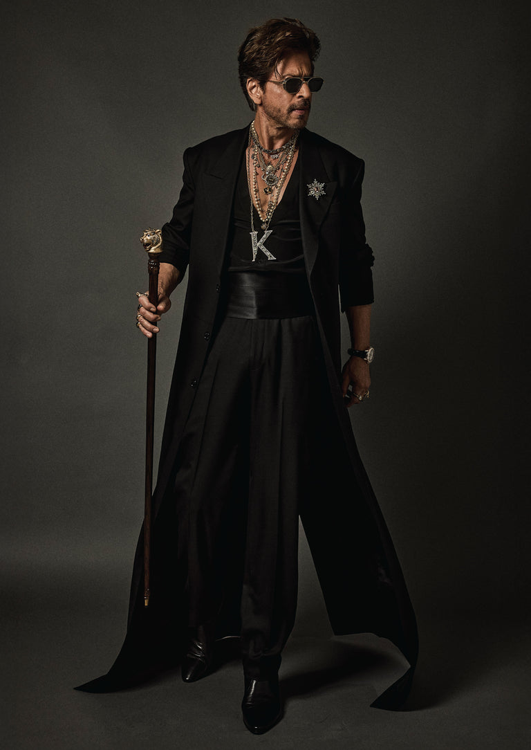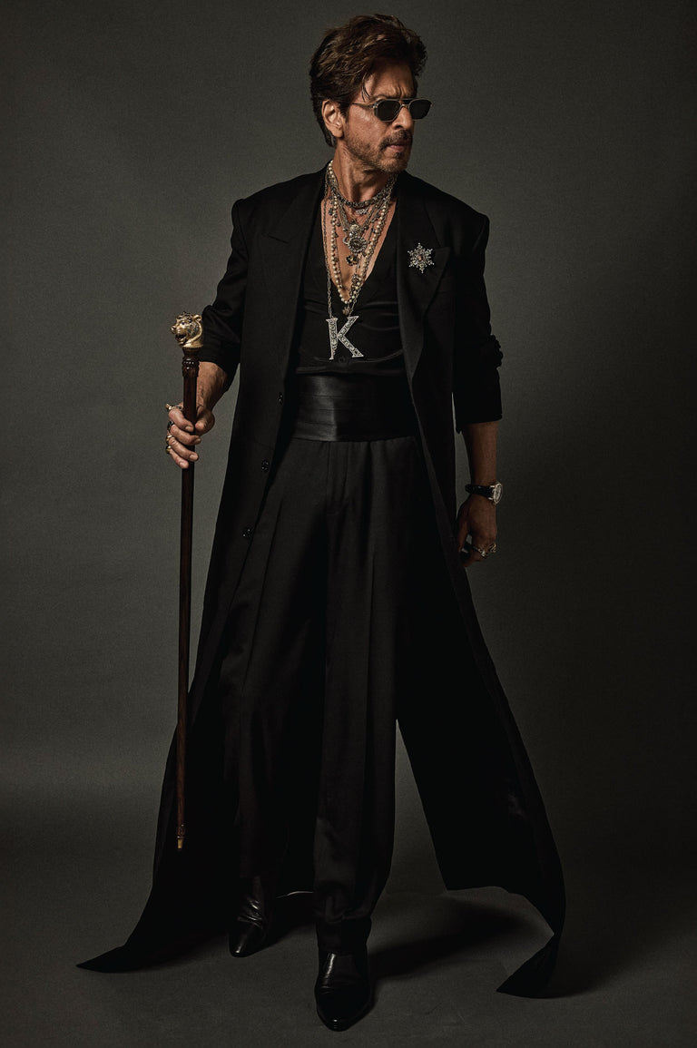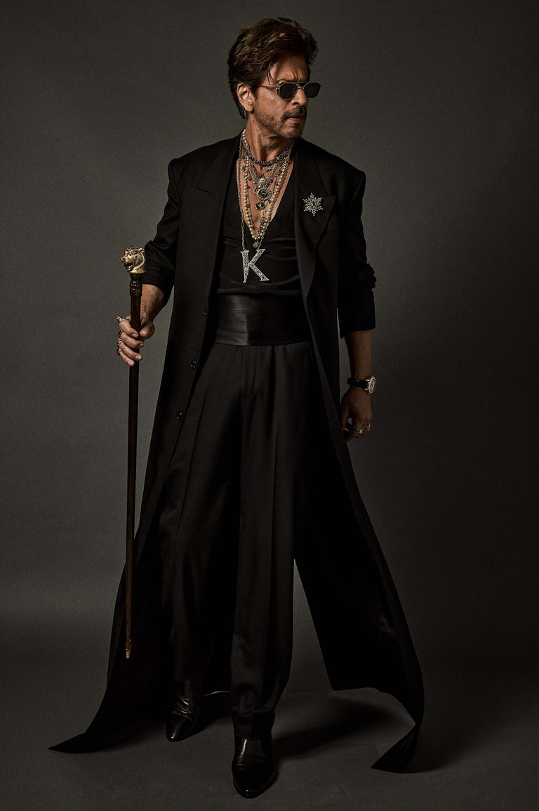 Shah Rukh Khan wears a floor length elongated coat in Tasmanian superfine wool with monogrammed, Japanese horn buttons. The coat is hand canvassed, single breasted with a peak collar and wide lapels. Paired with a crepe de chine silk shirt and tailored superfine wool trousers. A pleated satin kamarbandh completes this bespoke look. Layered with a custom stack and complemented with The Bengal Tiger Head Cane crafted in 18k gold with tourmalines, sapphires, old mine cut and brilliant cut diamonds.