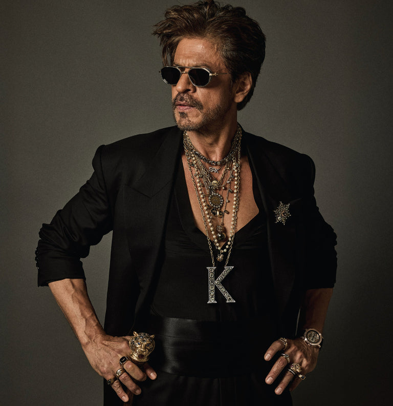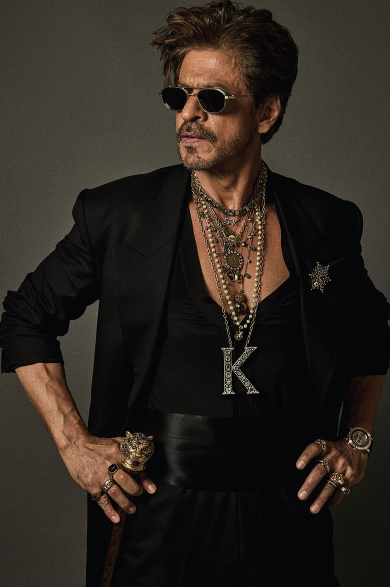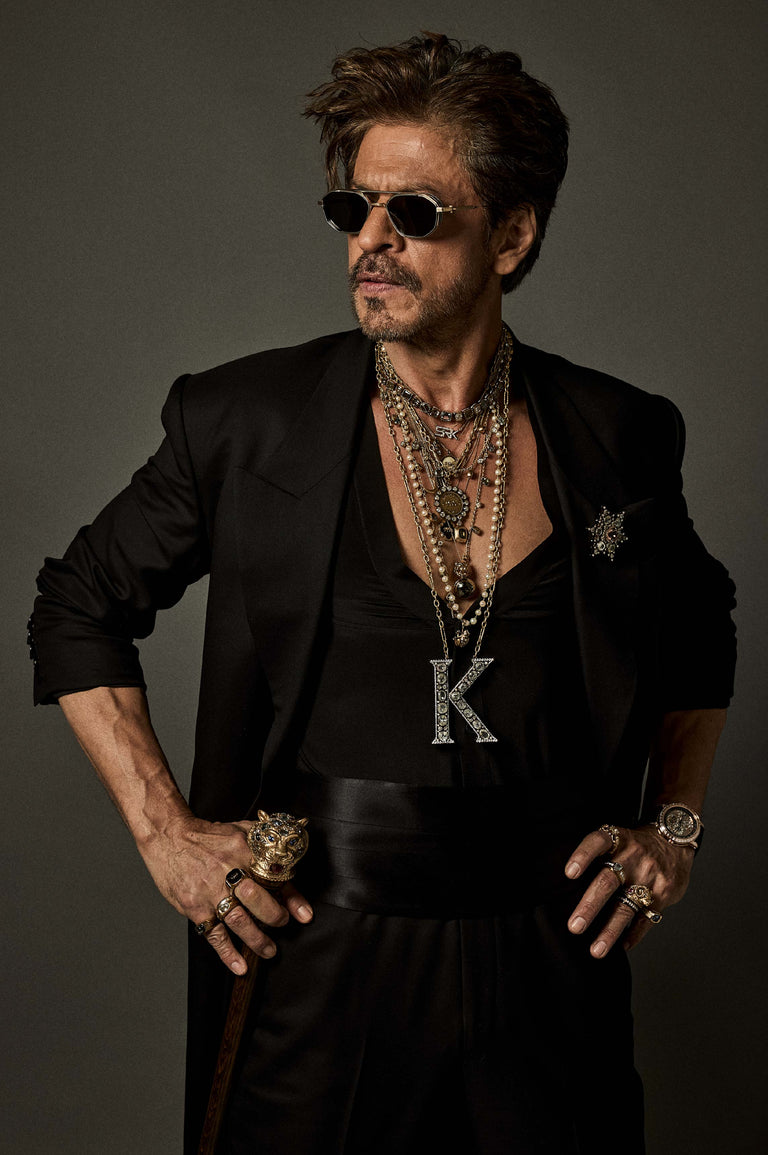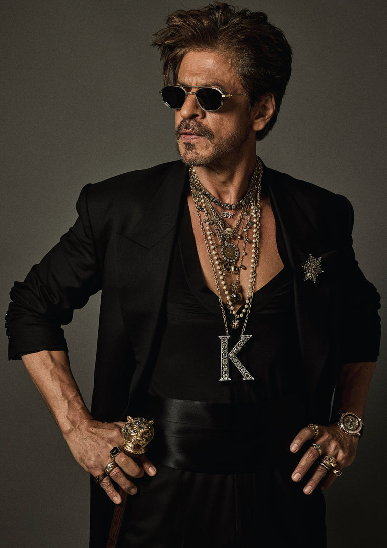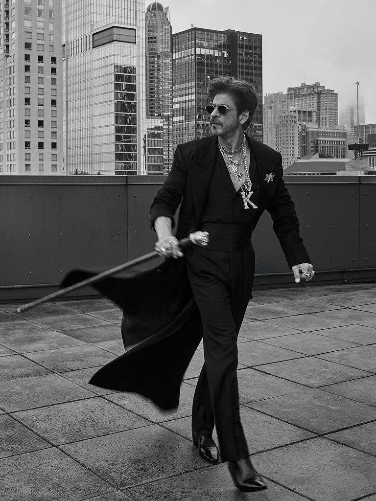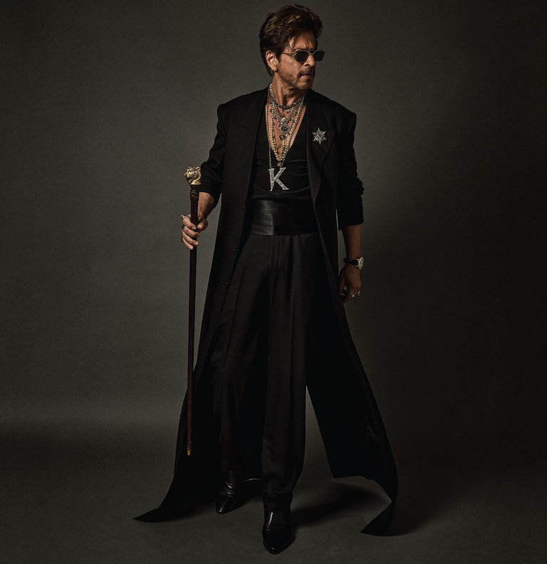 Shah Rukh Khan wears a floor length elongated coat in Tasmanian superfine wool with monogrammed, Japanese horn buttons. The coat is hand canvassed, single breasted with a peak collar and wide lapels. Paired with a crepe de chine silk shirt and tailored superfine wool trousers. A pleated satin kamarbandh completes this bespoke look. Layered with a custom stack and complemented with The Bengal Tiger Head Cane crafted in 18k gold with tourmalines, sapphires, old mine cut and brilliant cut diamonds.
