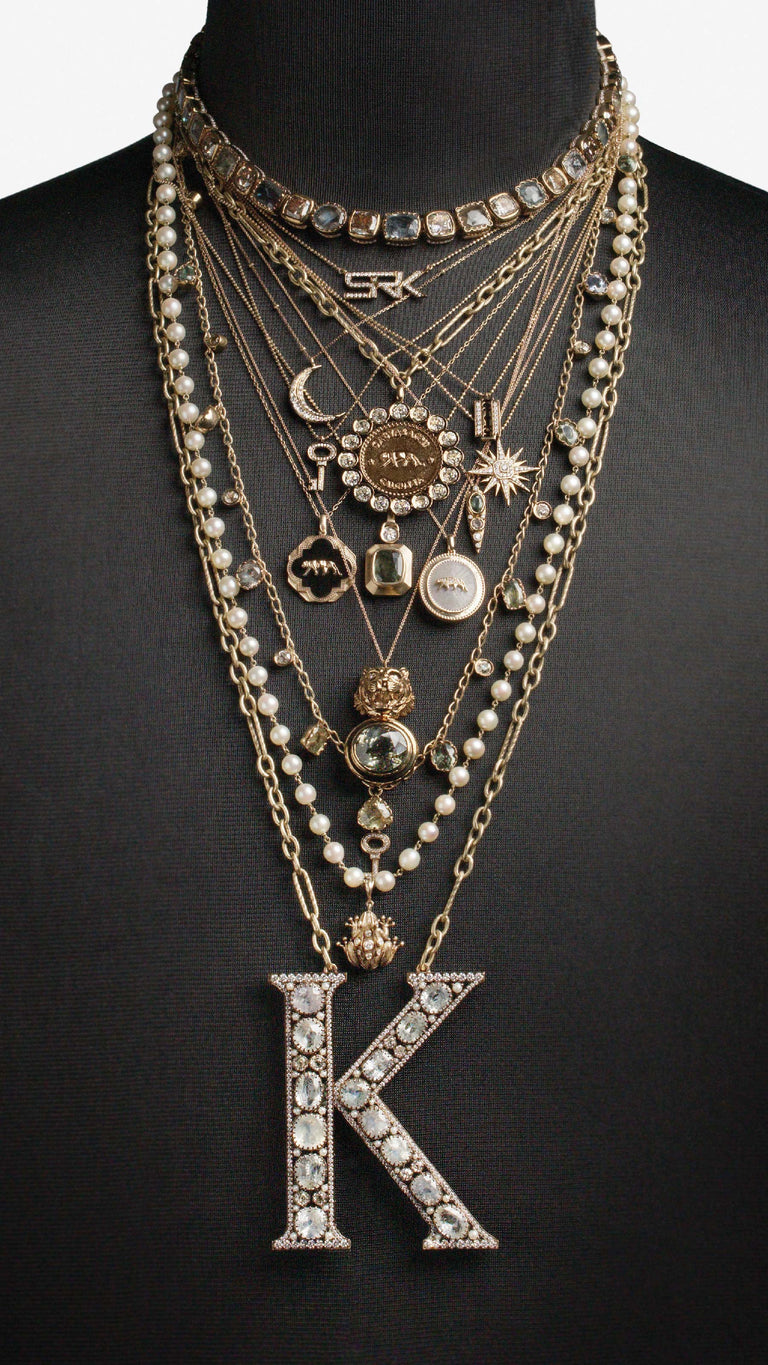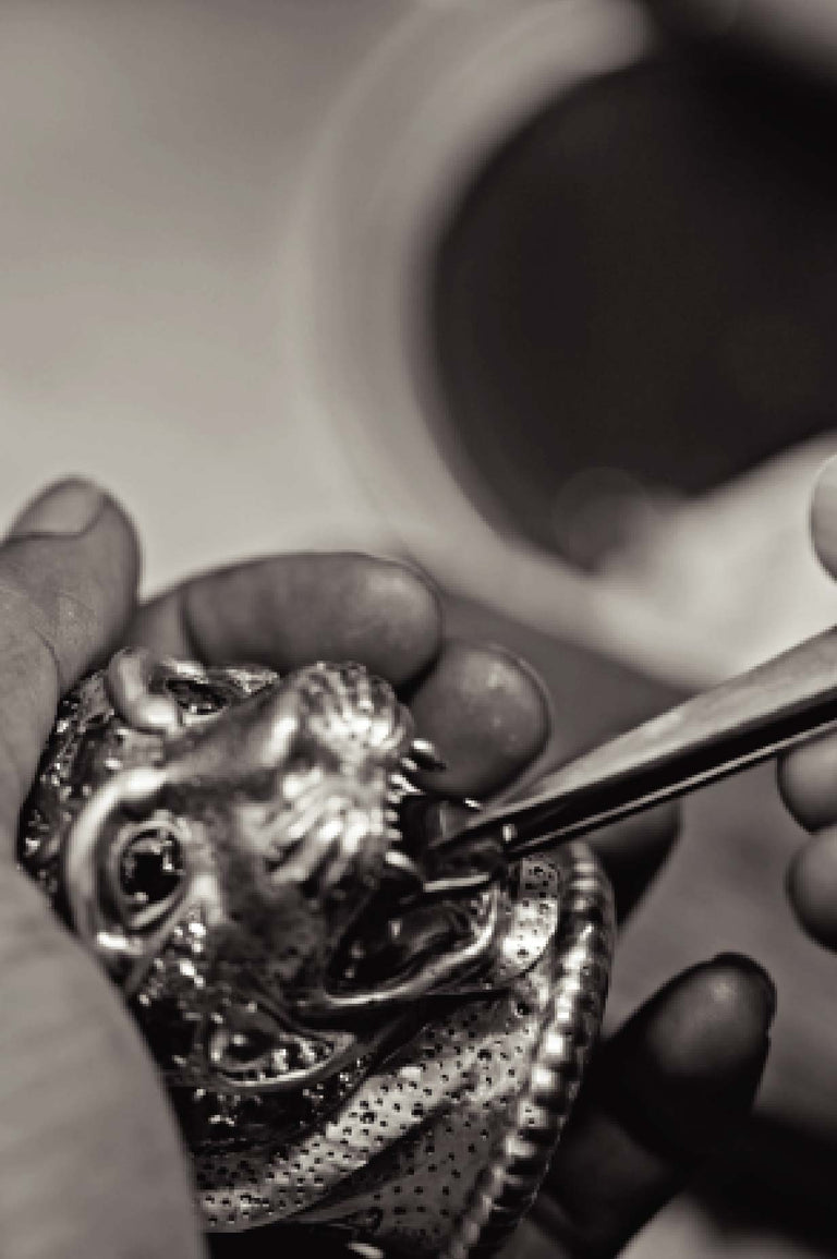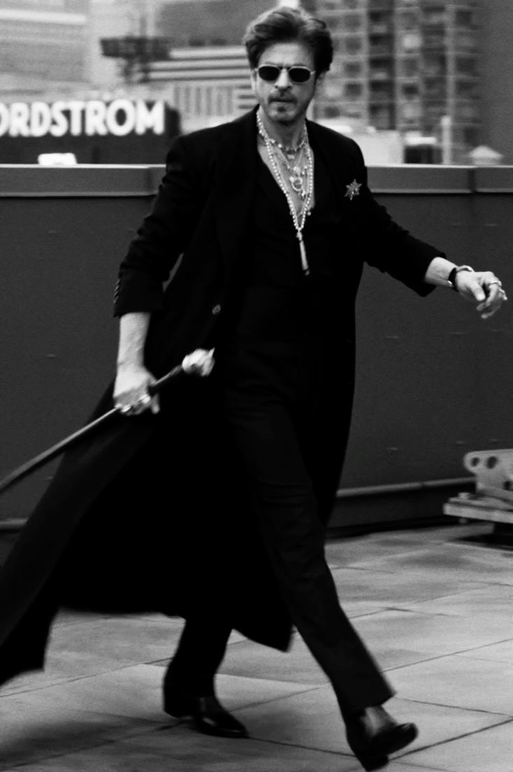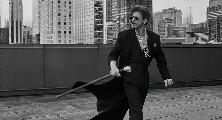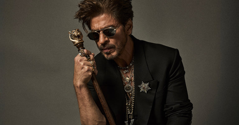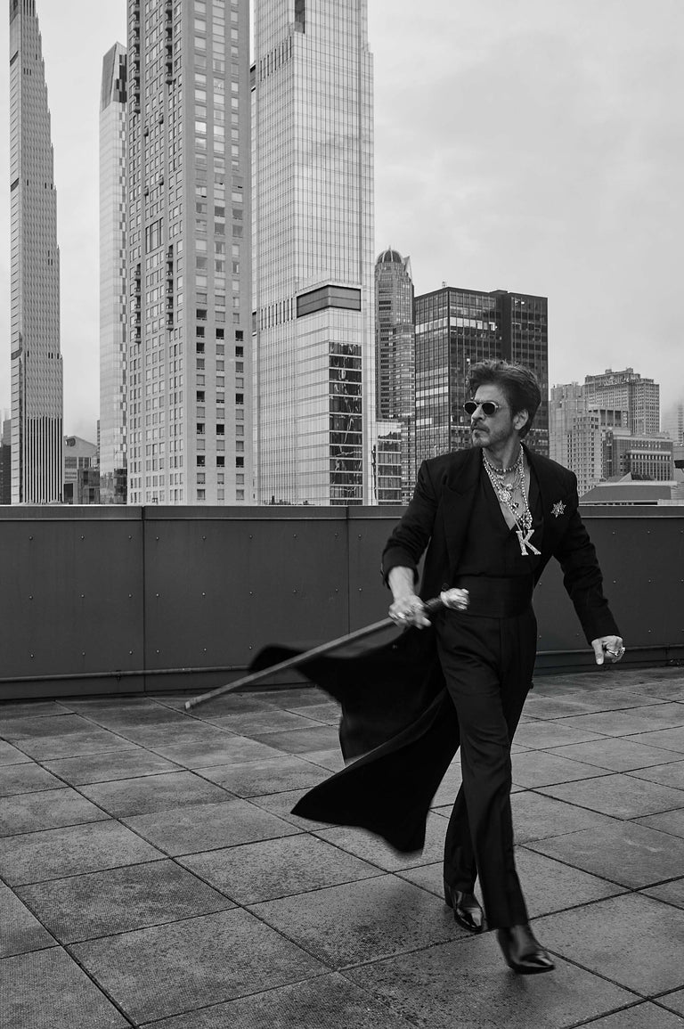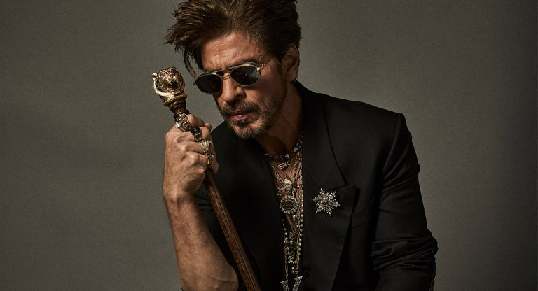 Shah Rukh Khan wears a floor length elongated coat in Tasmanian superfine wool with monogrammed, Japanese horn buttons. The coat is hand canvassed, single breasted with a peak collar and wide lapels. Paired with a crepe de chine silk shirt and tailored superfine wool trousers. A pleated satin kamarbandh completes this bespoke look. Layered with a custom stack and complemented with The Bengal Tiger Head Cane crafted in 18k gold with tourmalines, sapphires, old mine cut and brilliant cut diamonds.