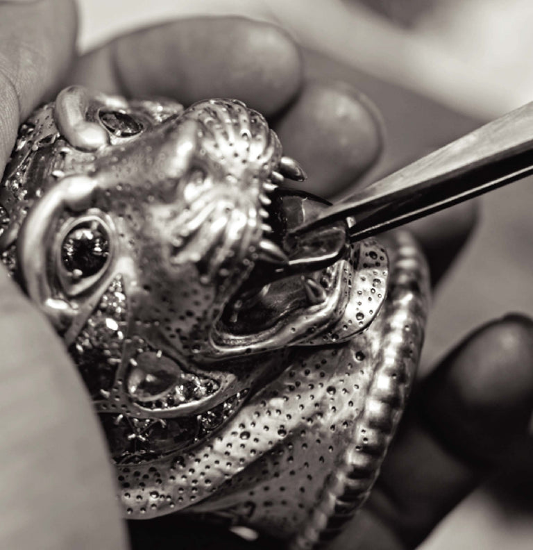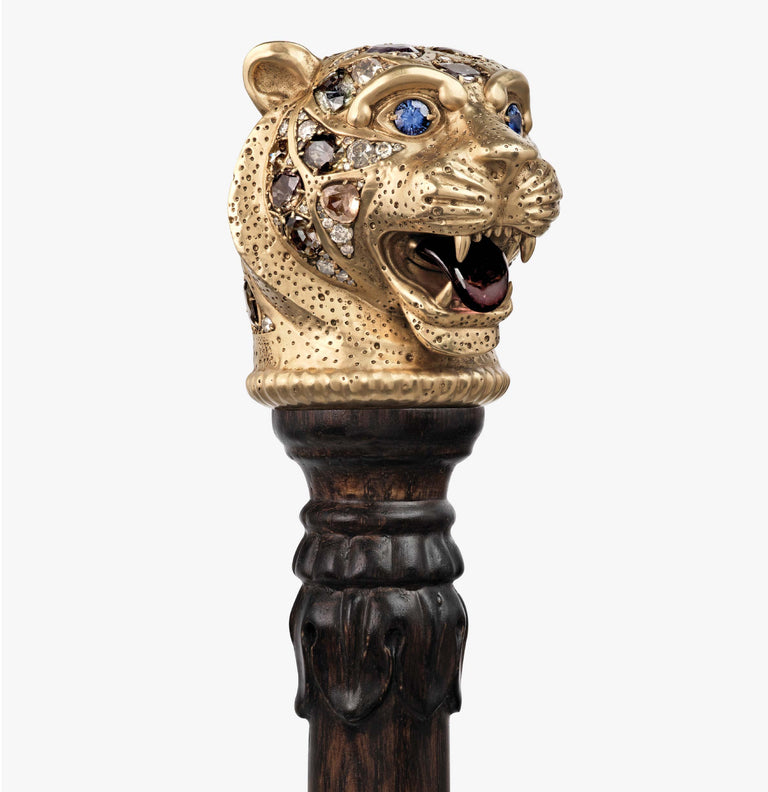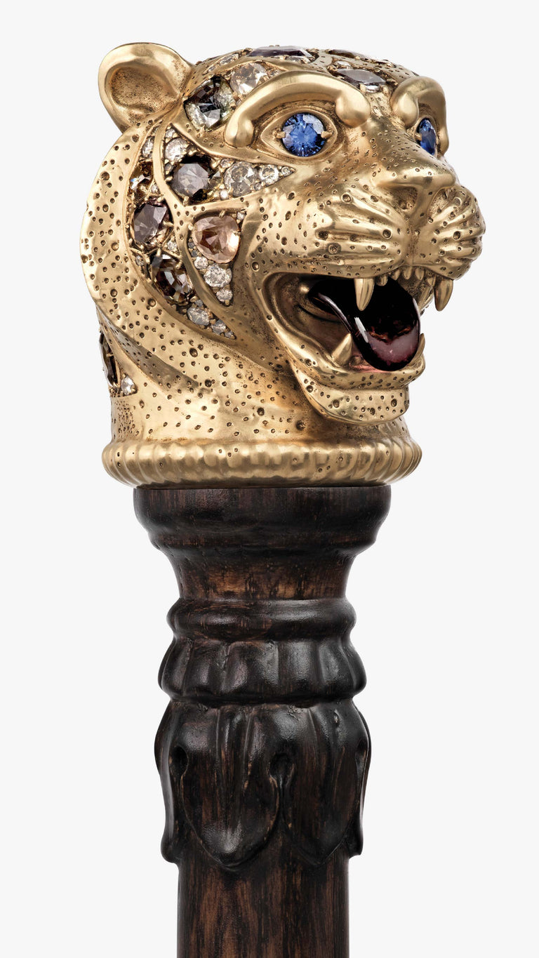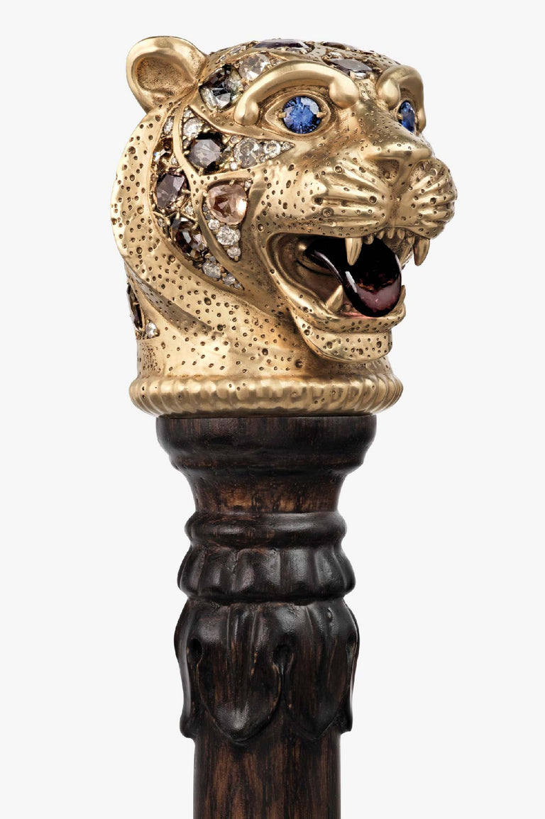 The Bengal Tiger Head Cane crafted in 18k gold with sapphires, tourmalines, old mine cut and brilliant cut diamonds.