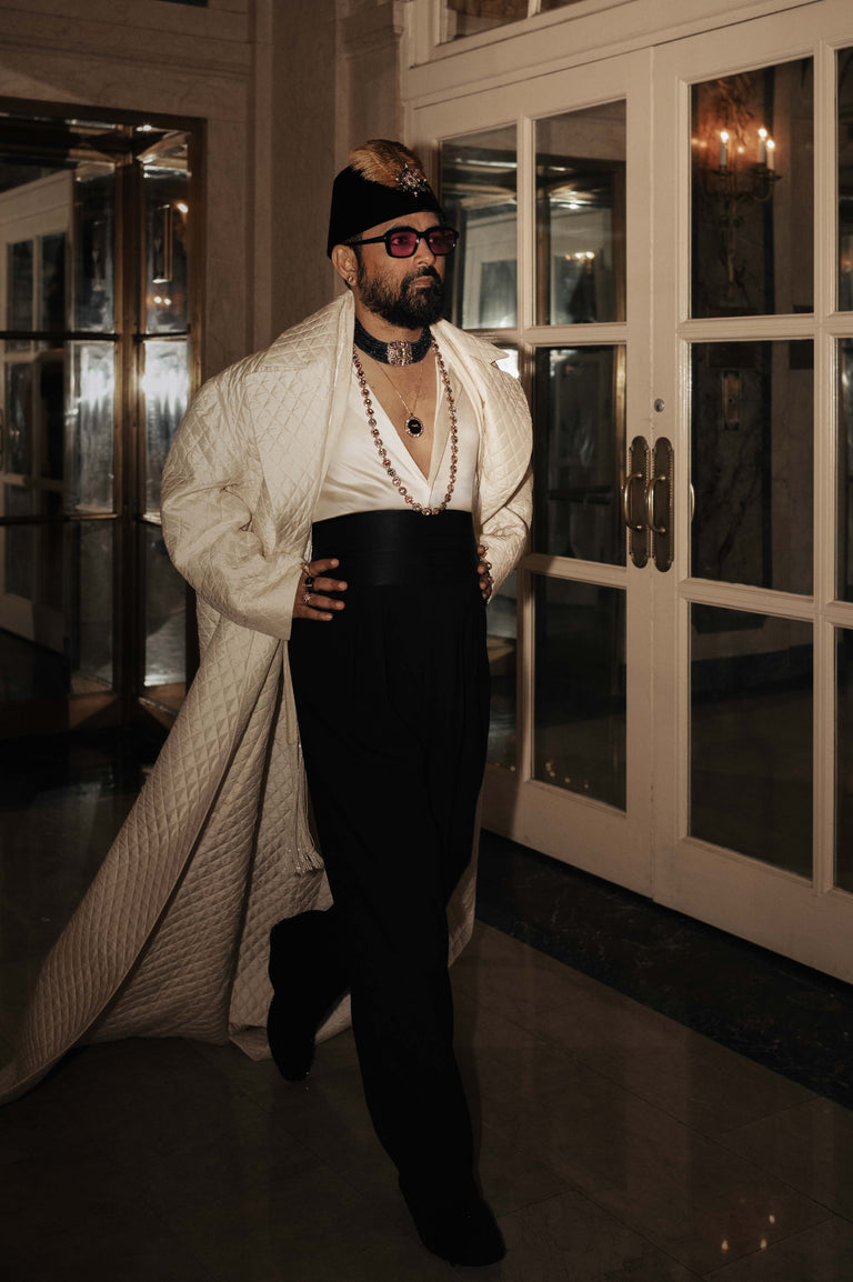 “We celebrate Dandyism on the MET GALA (Superfine: Tailoring Black Style) red carpet by bringing our own version with a uniquely Indian exuberance. The tradition of wearing neckties was inherited from the British colonial era, where formal dressing was a mark of elegance and refinement. Clubs in India, especially upscale ones, maintain dress codes that require formality, including ties to maintain a standard of decorum and ambience. In the Sabyasachi world the tie has been replaced with hand crafted Indian necklaces; formal for sure and richer indeed.”