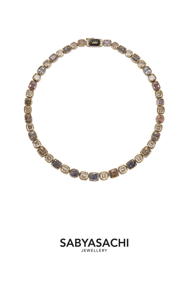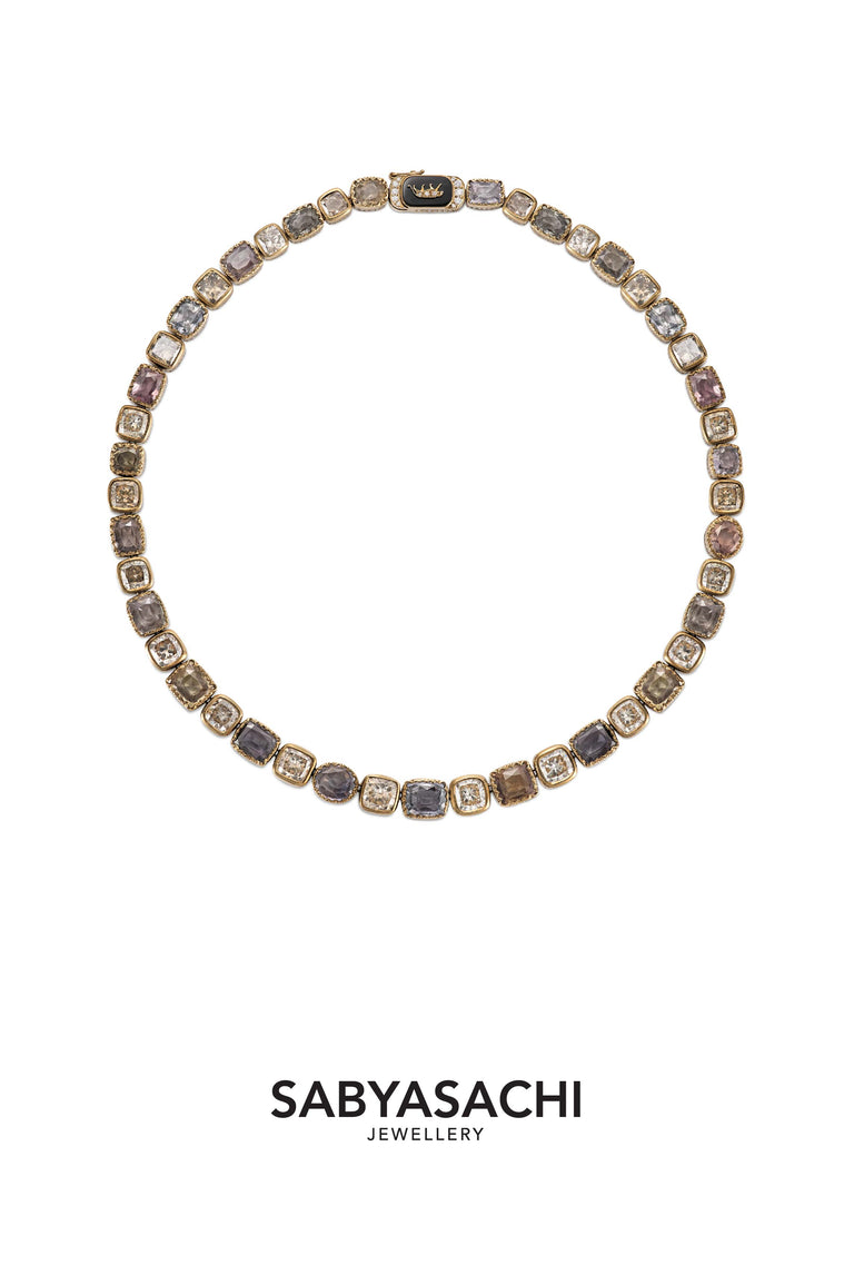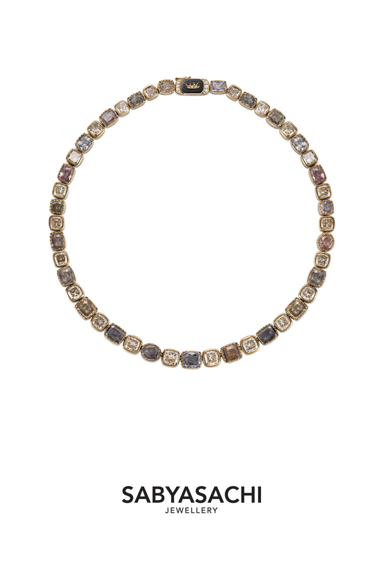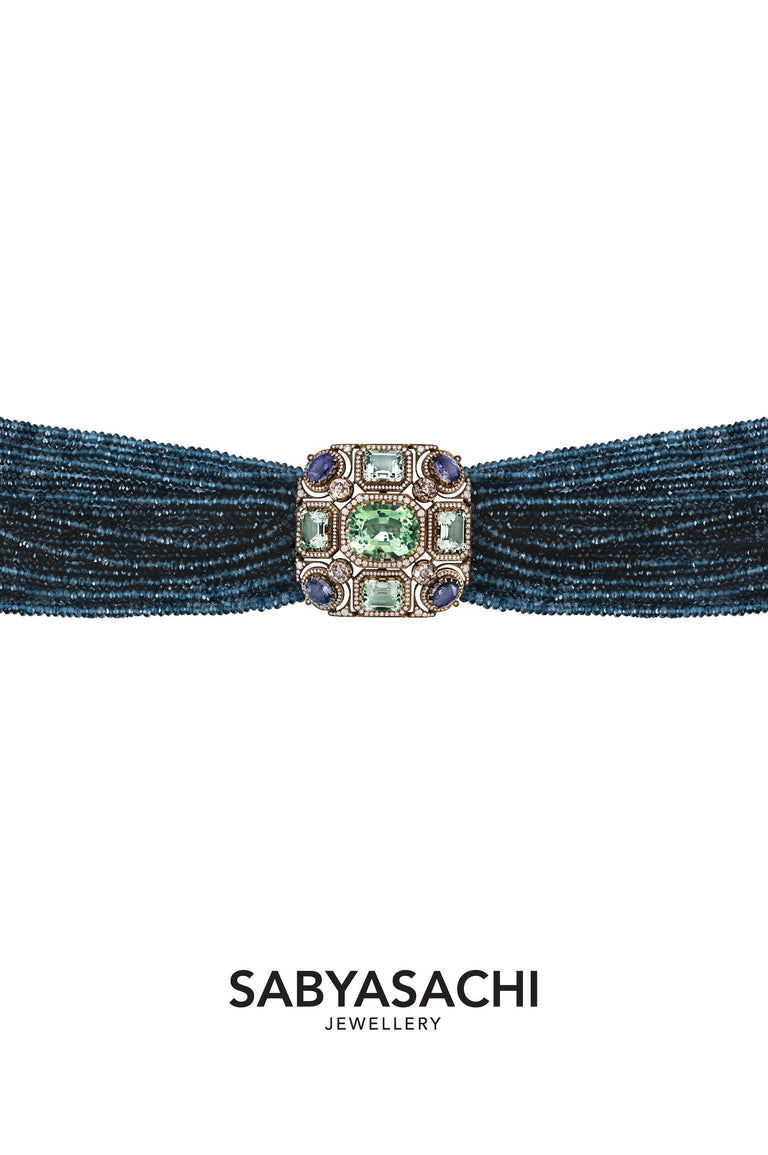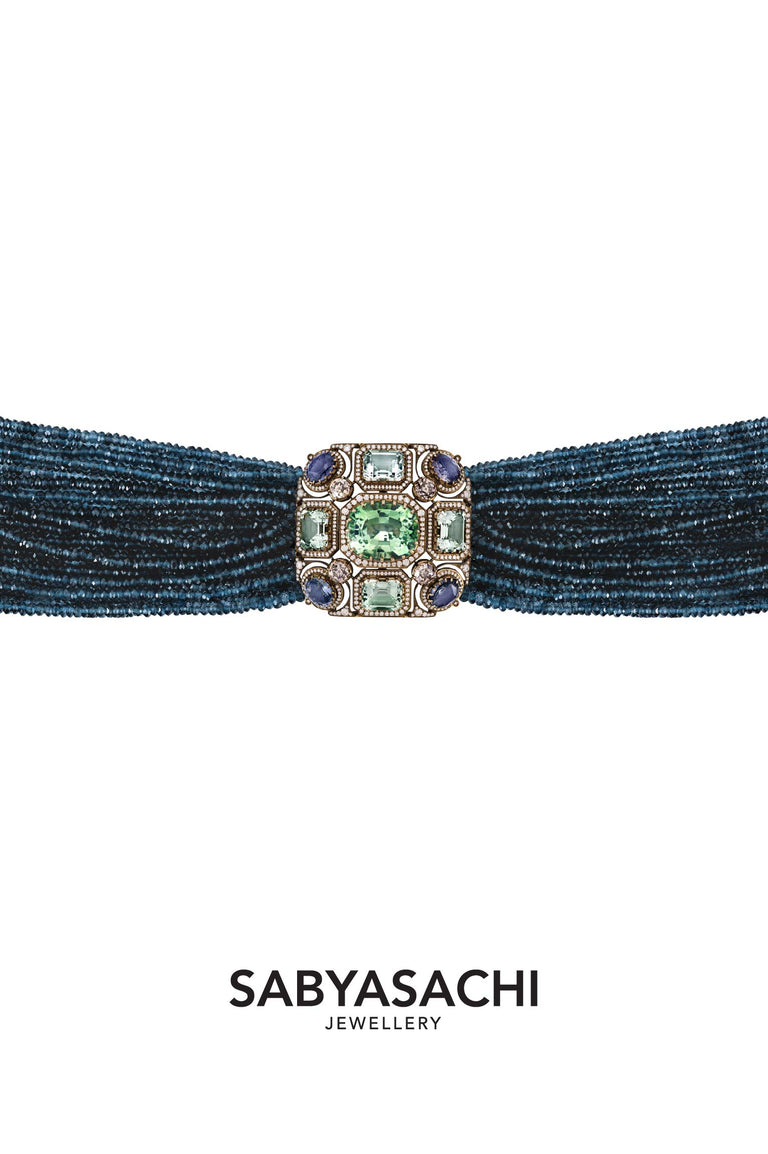 Custom stack from Sabyasachi Jewellery crafted in18k gold with sapphires, tourmalines, old mine cut and brilliant cut diamonds.