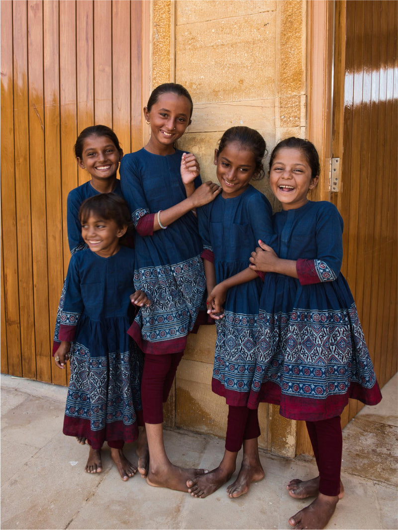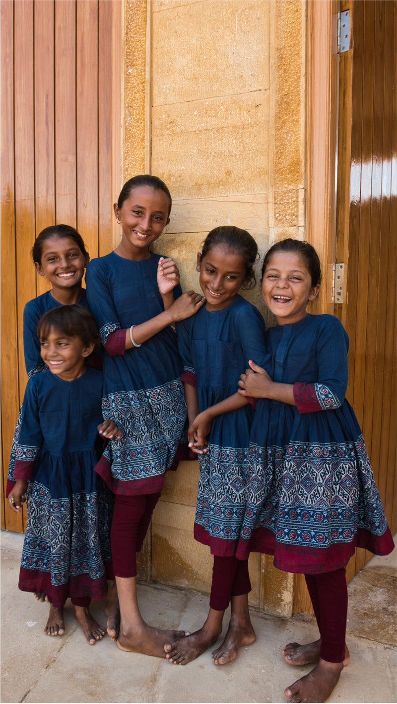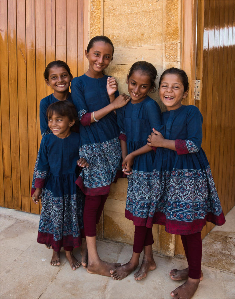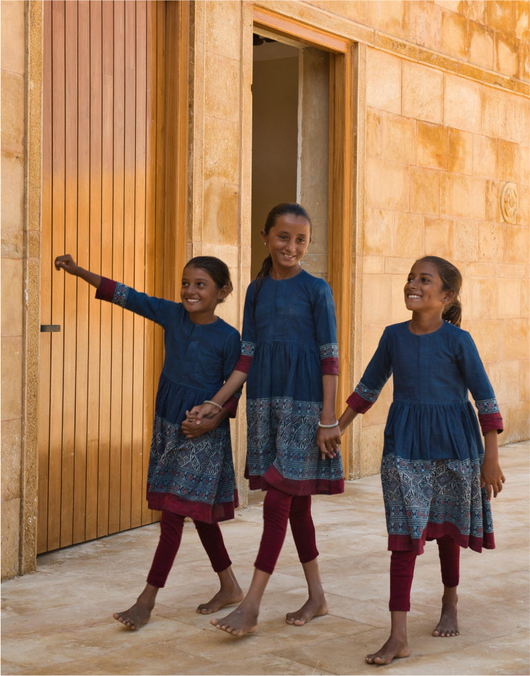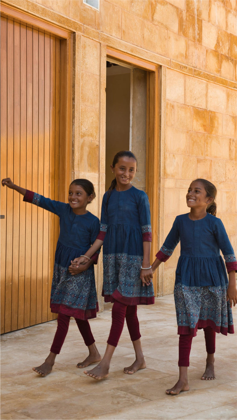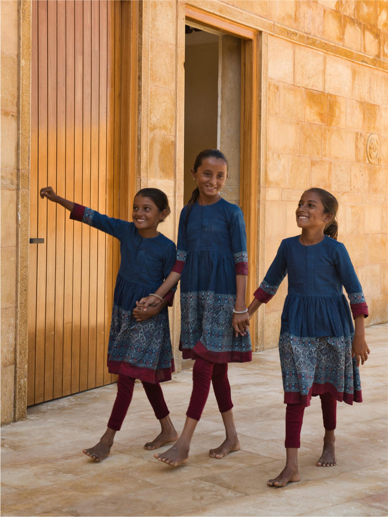 The Rajkumari Ratnavati Girls School in the Thar Desert of Jaisalmer in India is a unique initiative. The school accommodates 400 girls from play school to the tenth grade. It aims at providing them with an education alongside a training centre for traditional artisanal skills such as artistry, weaving and embroidery. A social initiative, the school was built by Diana Kellogg Architects in collaboration with Michael Daube’s CITTA, on donated land from Manvendra Singh Shekhawat. Sabyasachi designed the uniforms for the girls, using Ajrakh, a complex local craft of woodblock printing on cotton.