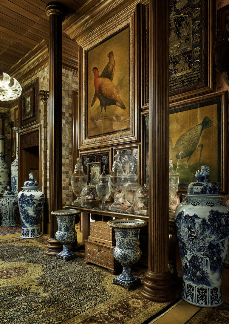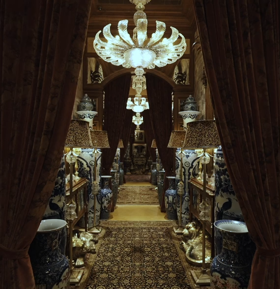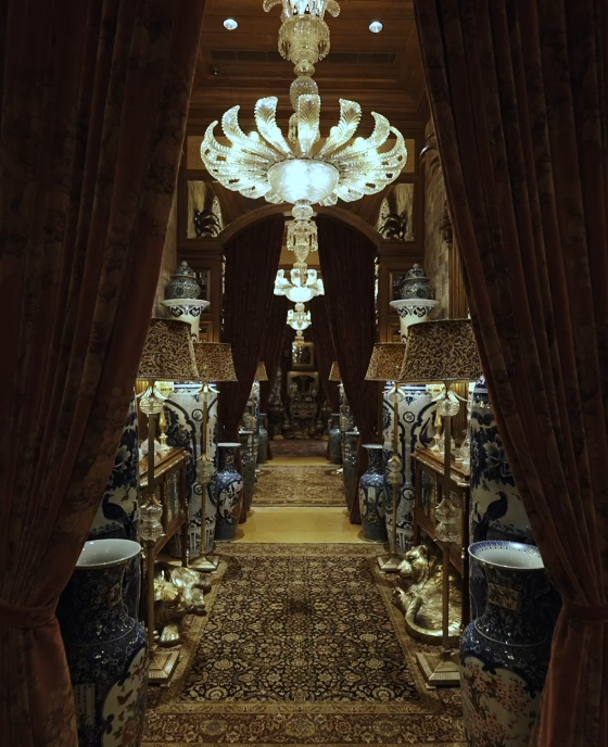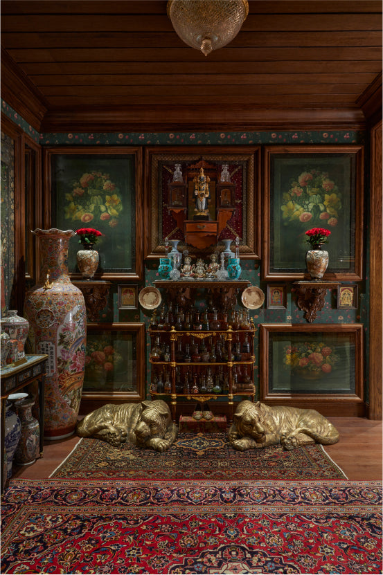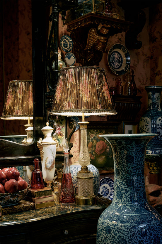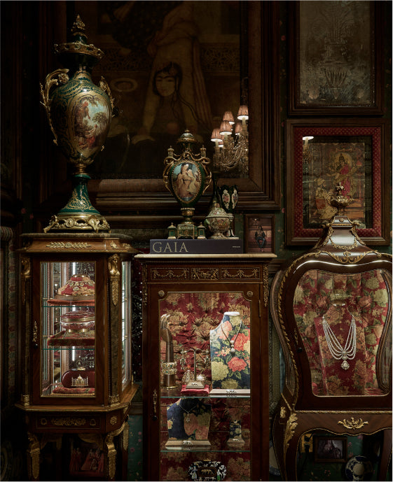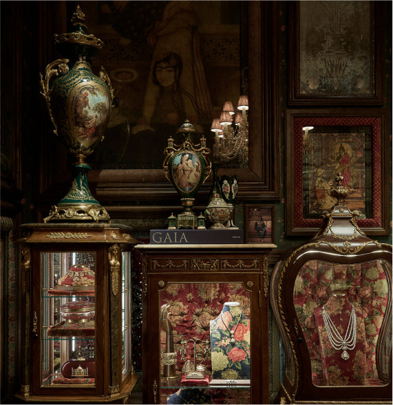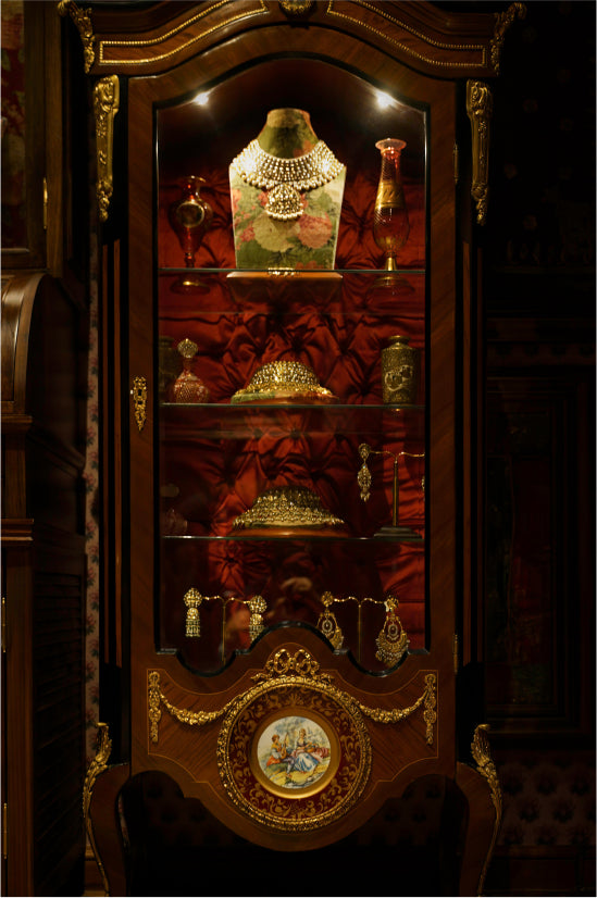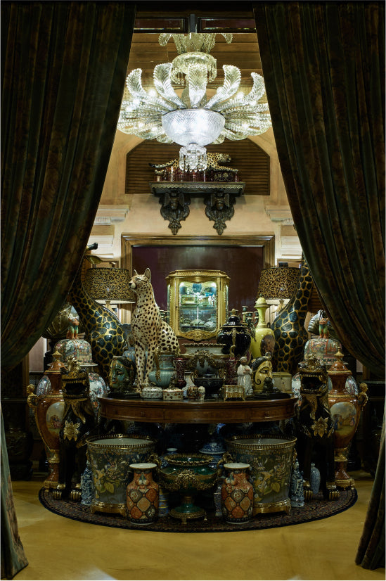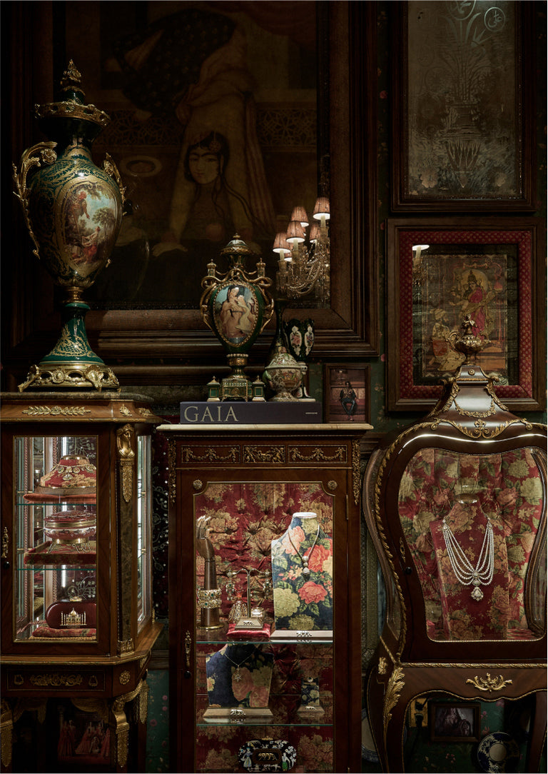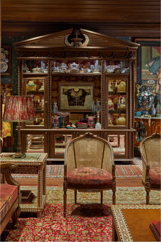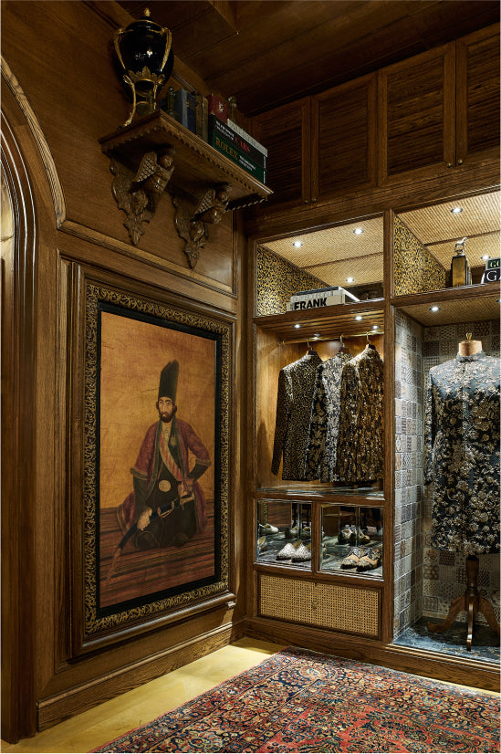 Each store is a living museum. Lined with hand painted art created by the Sabyasachi Art Foundation, layered between age-old original Tanjore paintings and Pichhwais in the Deccan, Nathdwara and Kota style. Around nooks you find vintage photography, Mughal miniatures, rare bronzes, 19th century Company Paintings and rare lithographs. Hand engraved curiosity cabinets sourced from souks in Morocco and Kashgar, 18th century handcarved Venetian furniture, rare French Art Nouveau cabinets and arrogant brass sculptures made by hand in Calcutta. Leather-bound books, Tang dynasty pottery, rare Canton vases and odd antiquities lie on retrofitted turn of the century furniture with fine inlay work, alongside the house’s now signature block printed silk velvet lined busts, vitrines and lampshades. From Rajasthan to Bengal, vintage, handwoven and crafted textiles from across India can be found all across the store, showcasing a sliver of India’s grand crafts legacy. While the wallpaper and upholstery are part of the Sabyasachi for Nilaya collection by Asian Paints, presenting various house motifs and hallmarks.