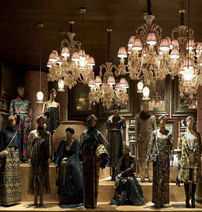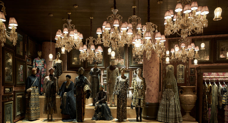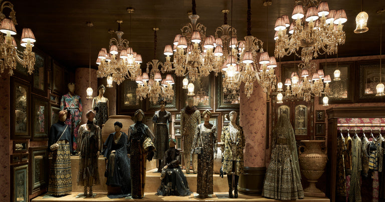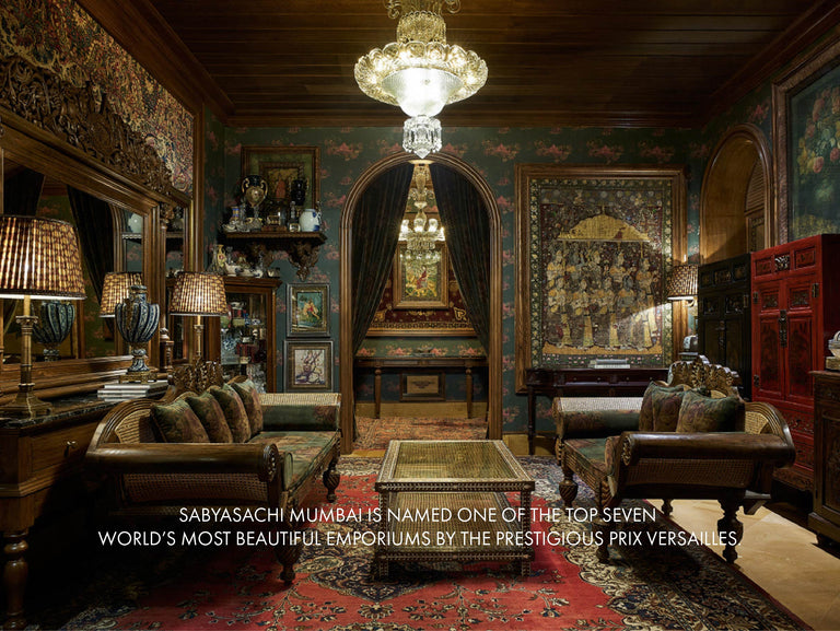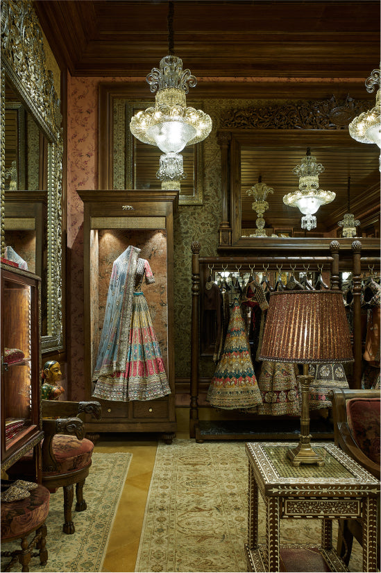 The notes of rose, sandalwood and frankincense waft through each store. Intermingling with the sounds of Rabindra Sangeet and Madonna to old Bollywood classics and Édith Piaf—each playlist carefully curated by Sabyasachi. Tea from the finest independent tea estates of India is served with small batch fruitcakes and ginger biscuits that are sourced from local artisanal bakeries. All under the warm glow of exquisite gleaming hand cut chandeliers and cosy hand knotted rugs and kilims. The art of retail at Sabyasachi is embedded in the artisanal and the handcrafted.