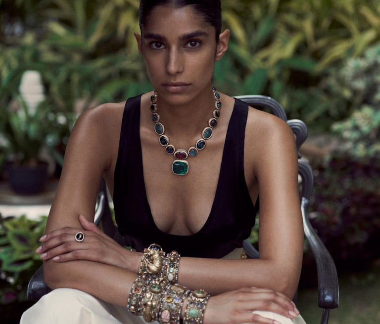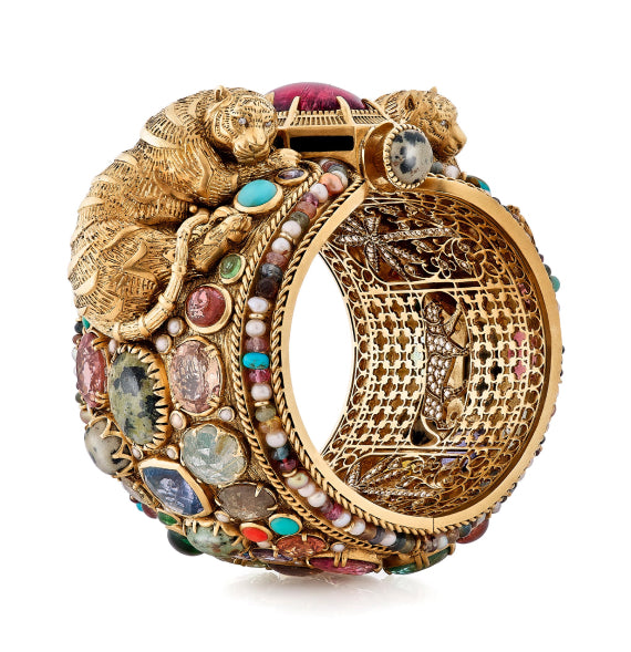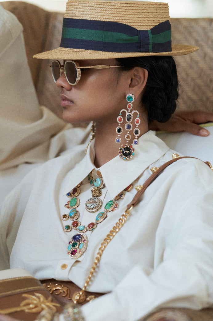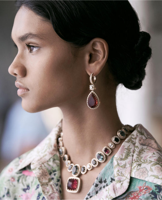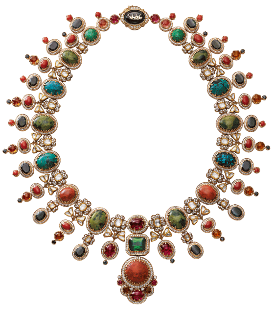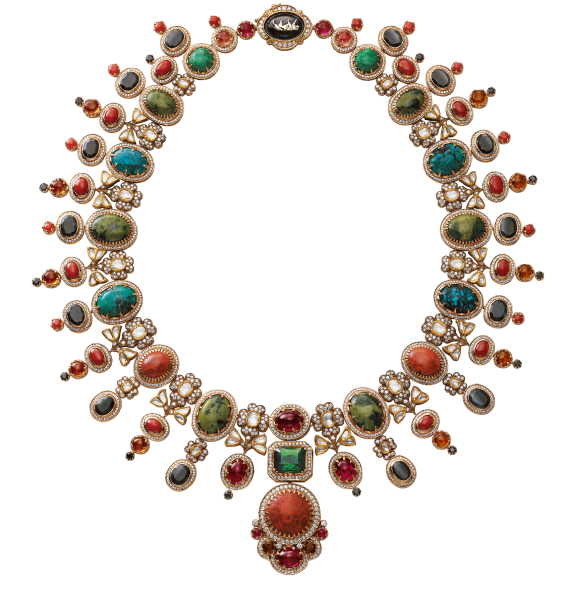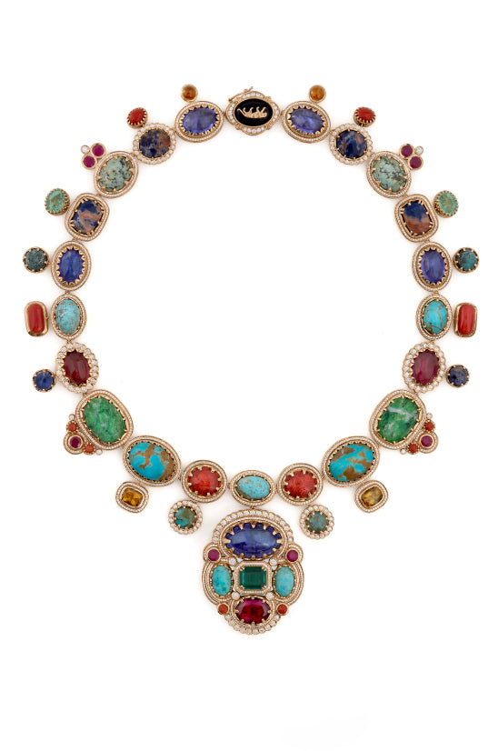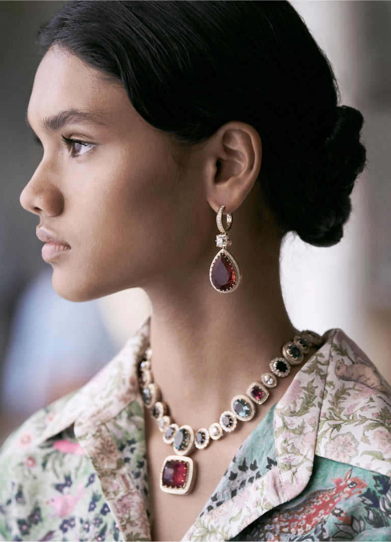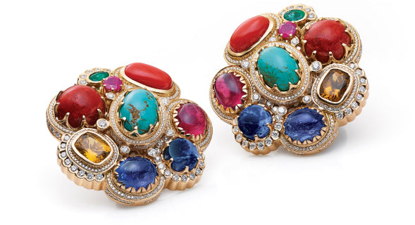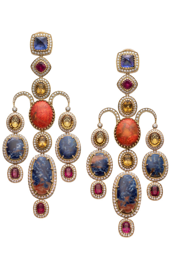 A tribute to the architectural geometry and unusual colours of stained glass, terrazzo tiles and marbles found in the mansions of North Calcutta. The Cossipore is crafted in gold with multi coloured and organic gemstones, and studded with brilliant cut EF VVS VS diamonds.