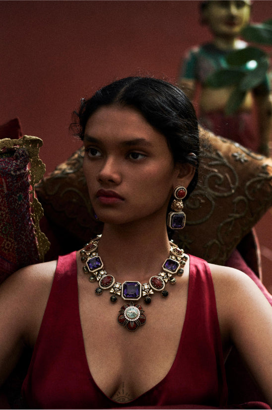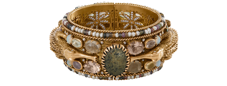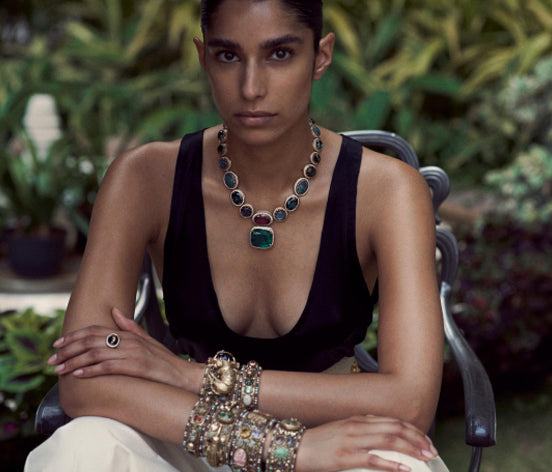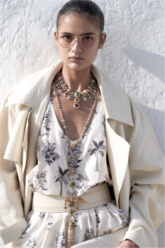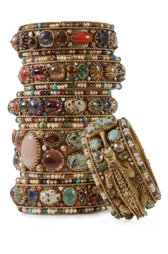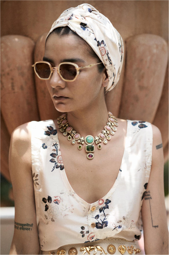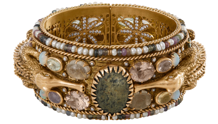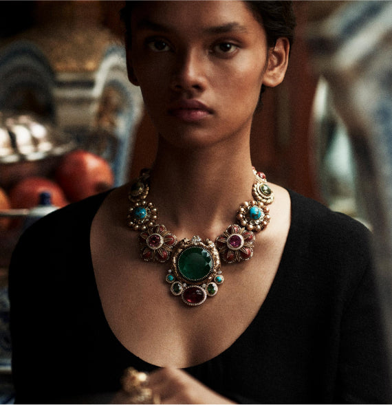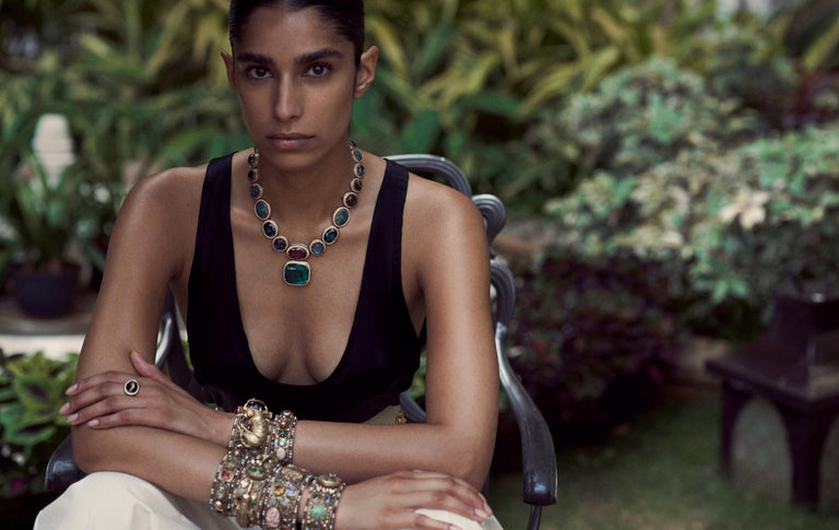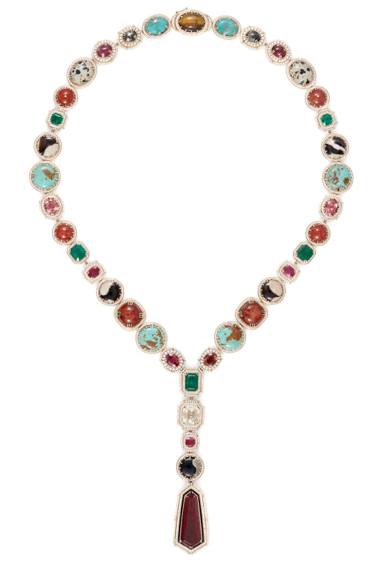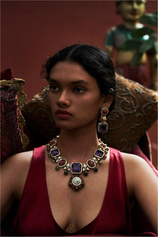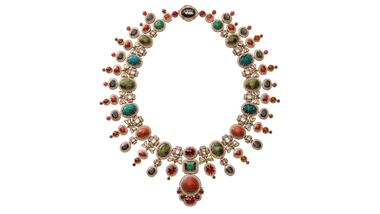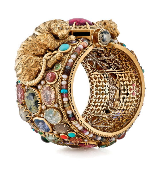 A tribute to the architectural geometry and unusual colours of stained glass, terrazzo tiles and marbles found in the mansions of North Calcutta. The Cossipore is crafted in gold with multi coloured and organic gemstones, and studded with brilliant cut EF VVS VS diamonds.