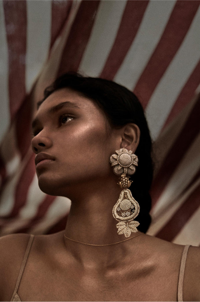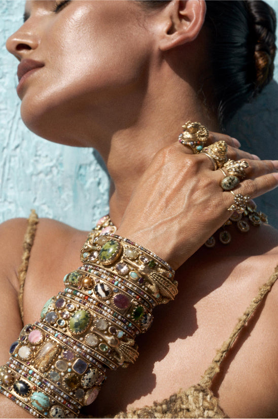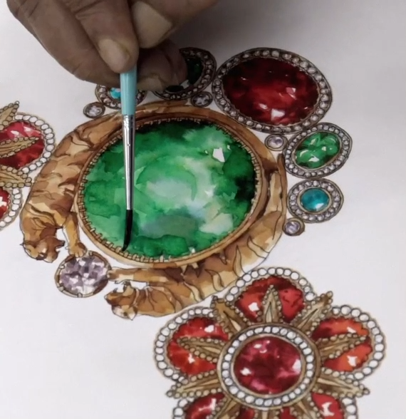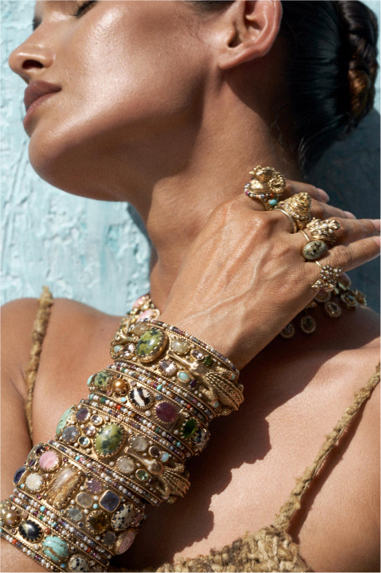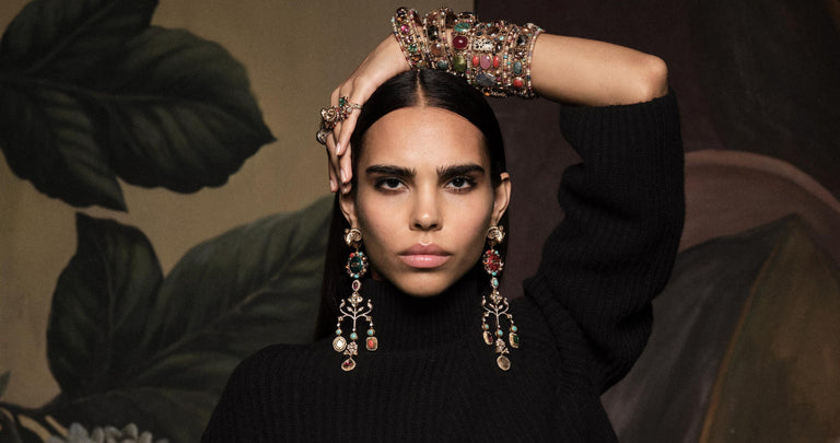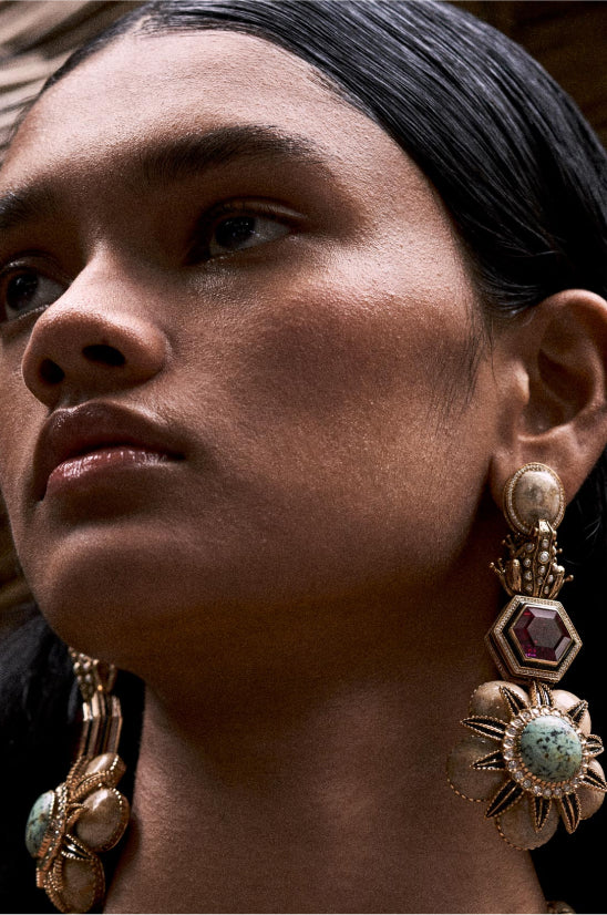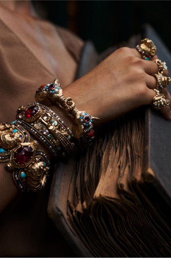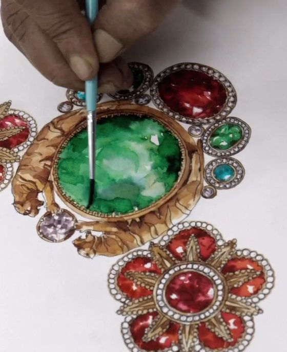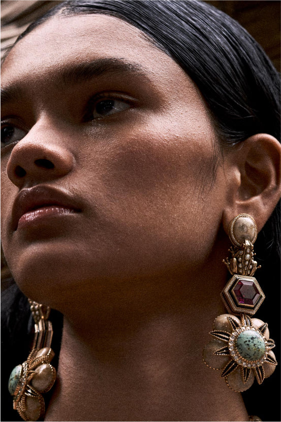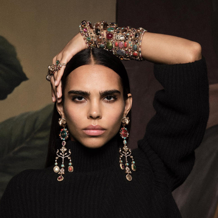 A tribute to the architectural geometry and unusual colours of stained glass, terrazzo tiles and marbles found in the mansions of North Calcutta. The Cossipore is crafted in gold with multi coloured and organic gemstones, and studded with brilliant cut EF VVS VS diamonds.