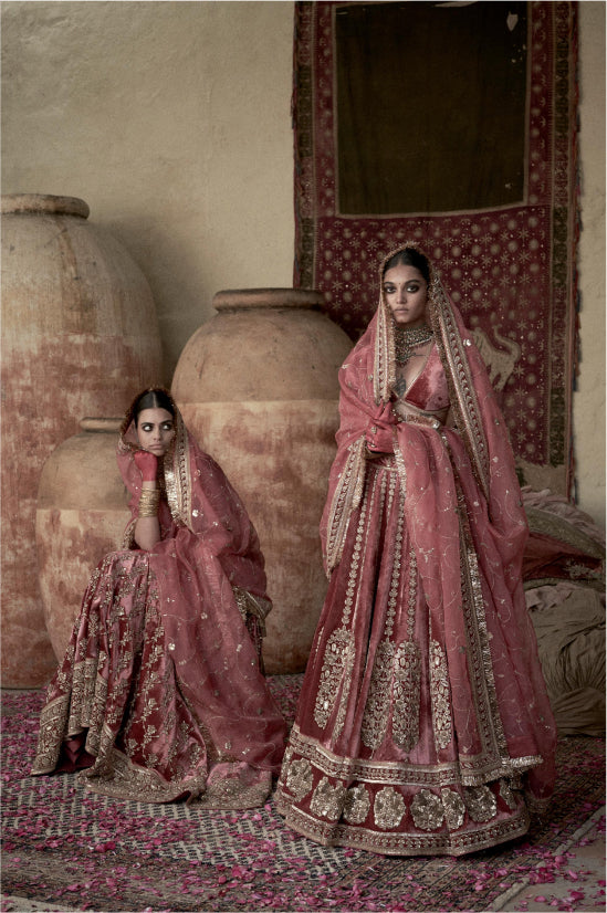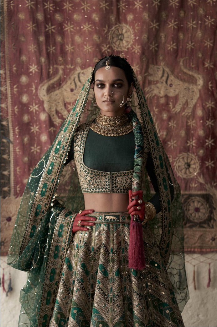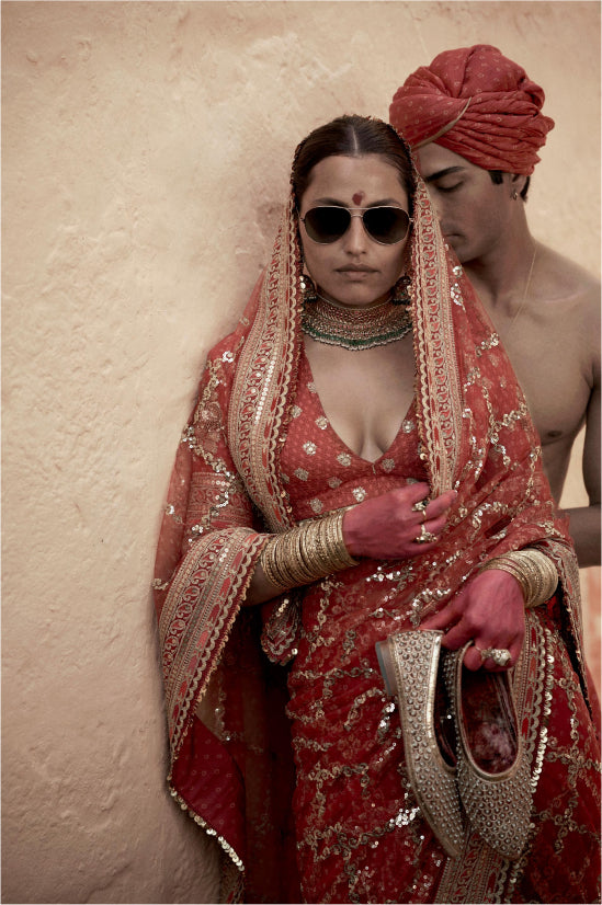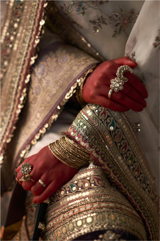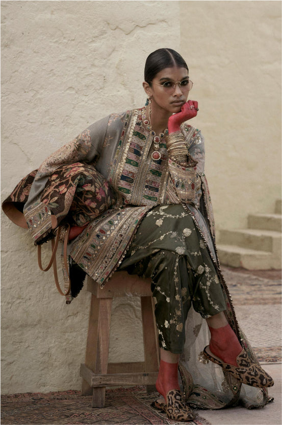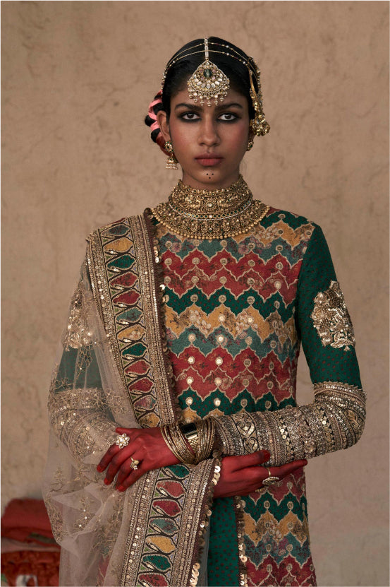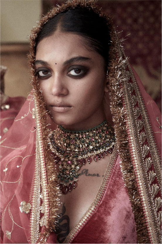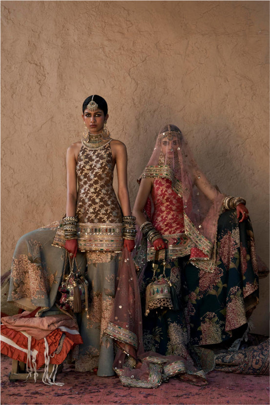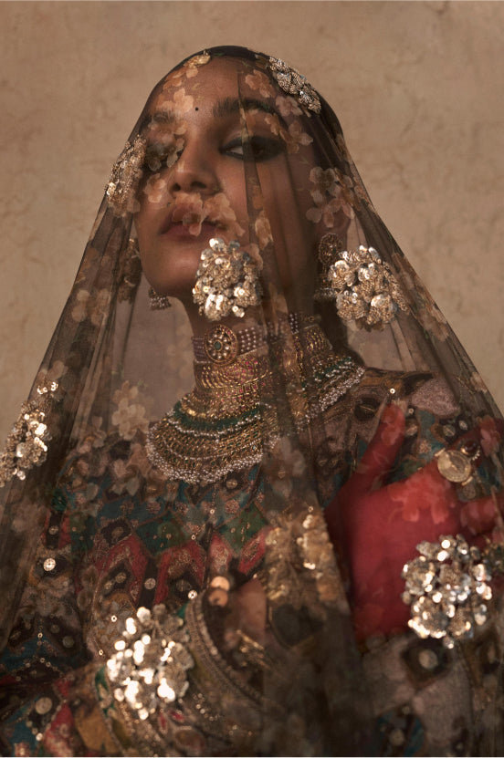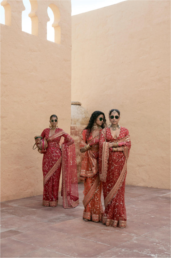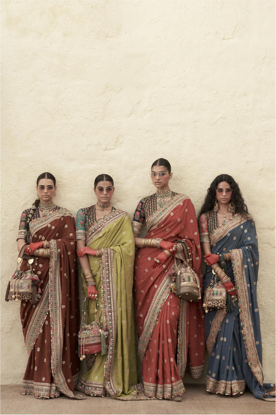 A celebration of classics. Matka silks, organzas, velvets and brocades, hand embroidered with zardozi, tilla work and gota tell a story of authenticity and the finest of Indian craftsmanship. Paired with heritage jewellery that brings back the grand artisanal legacy of India. This is our homage to tradition even as we celebrate the dynamism of today.
