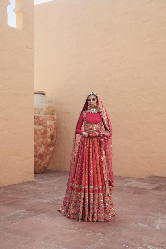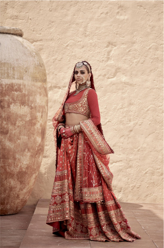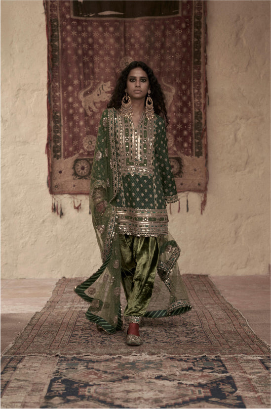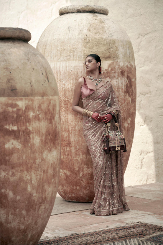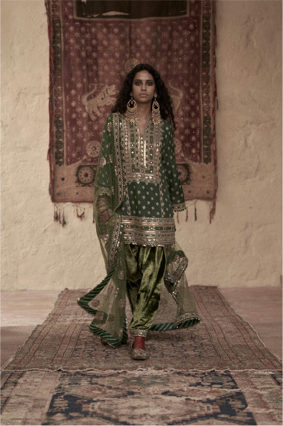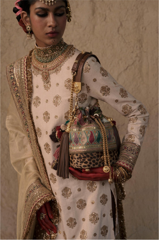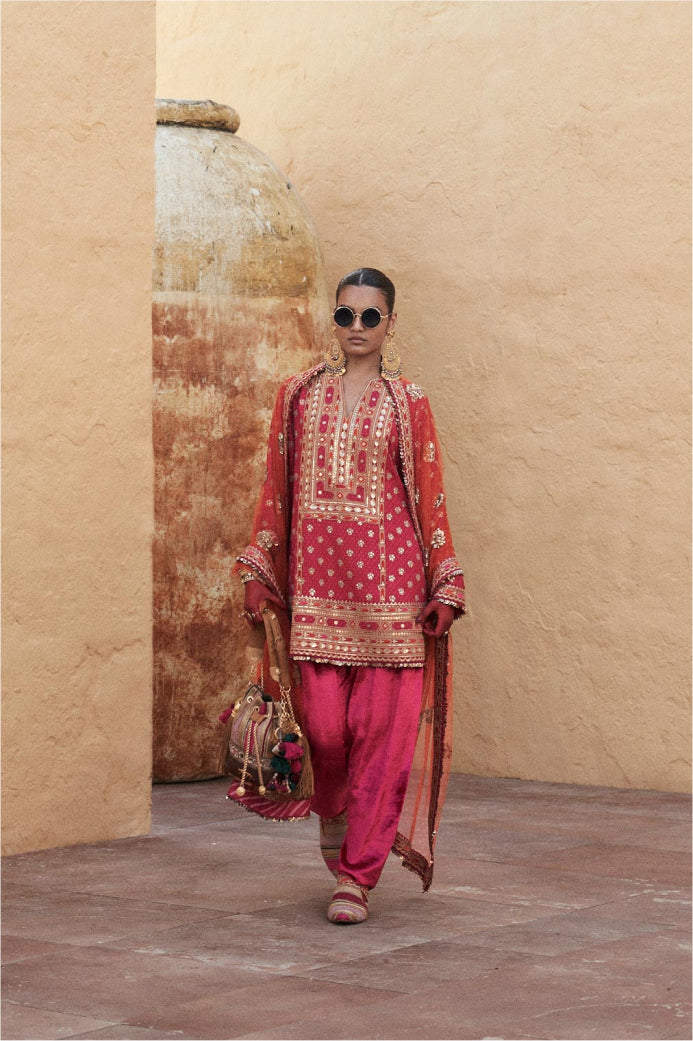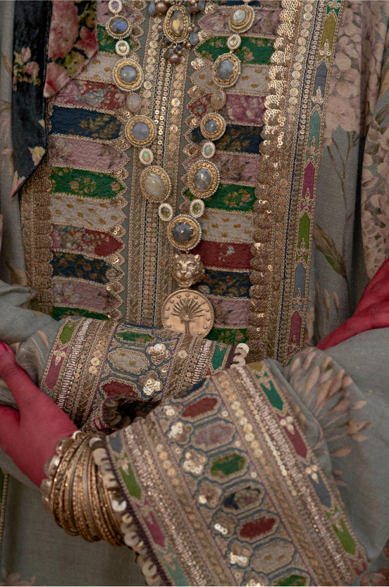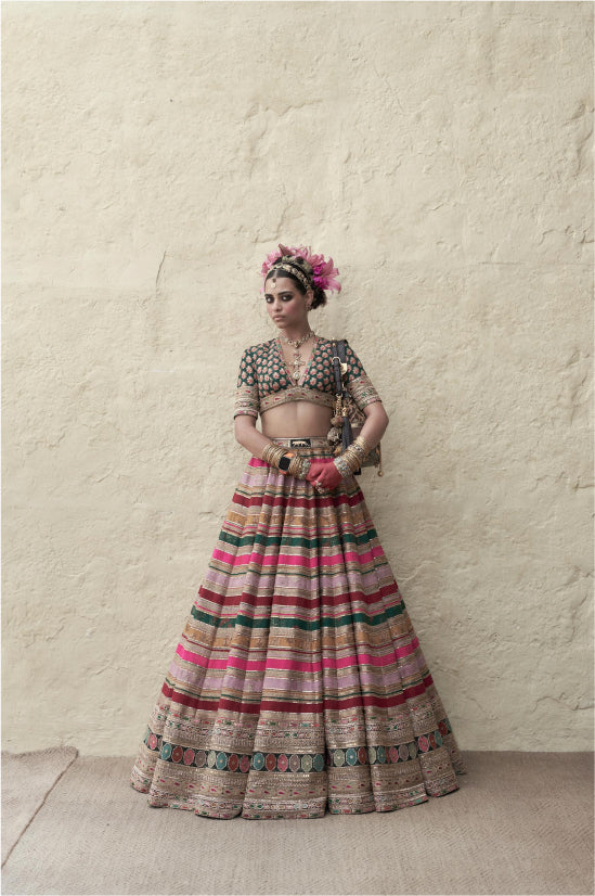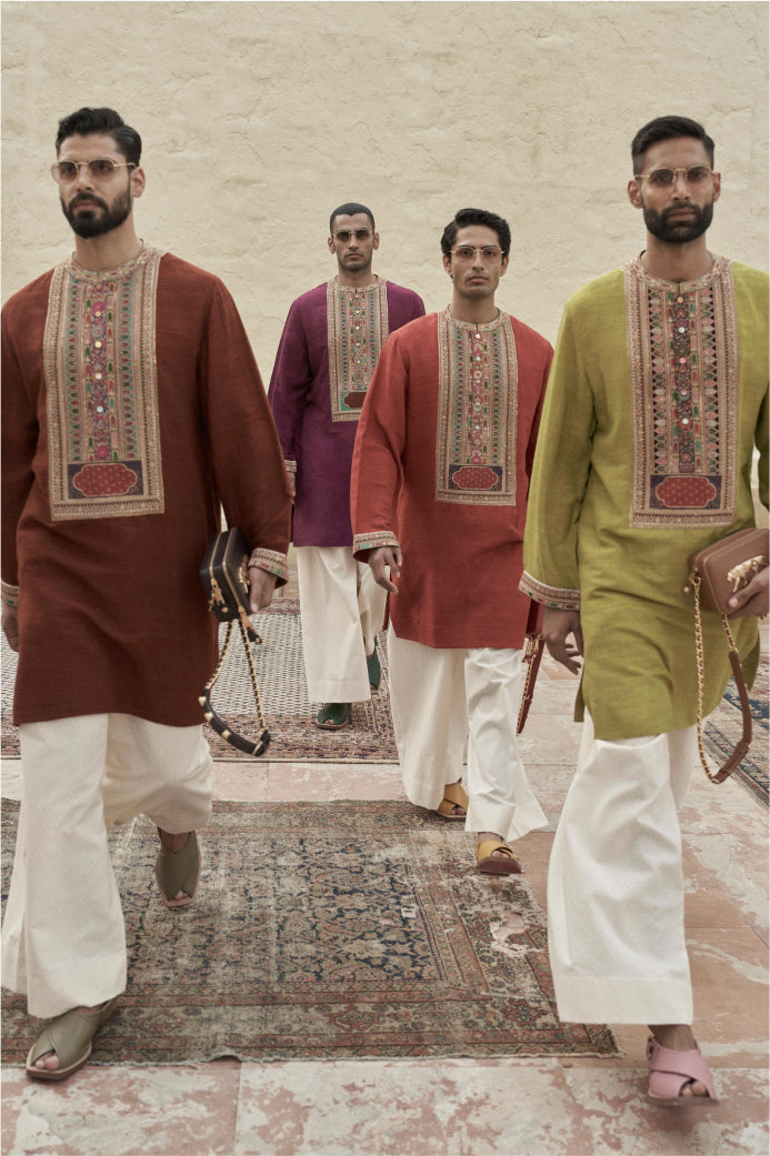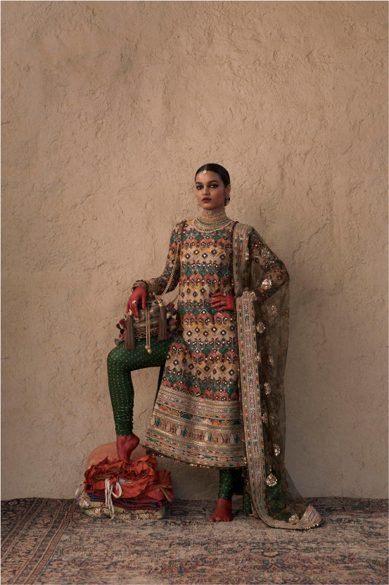 A celebration of classics. Matka silks, organzas, velvets and brocades, hand embroidered with zardozi, tilla work and gota tell a story of authenticity and the finest of Indian craftsmanship. Paired with heritage jewellery that brings back the grand artisanal legacy of India. This is our homage to tradition even as we celebrate the dynamism of today.