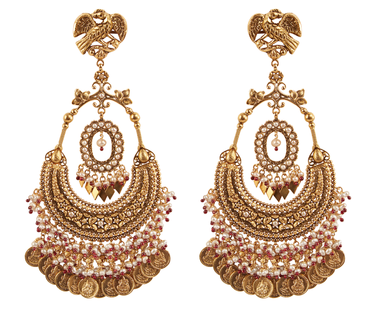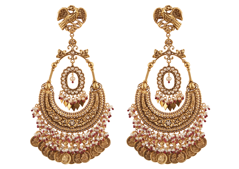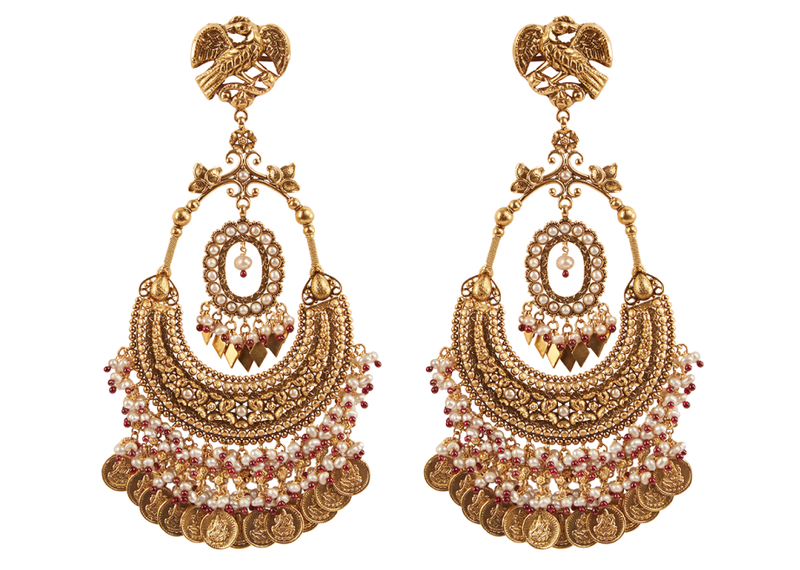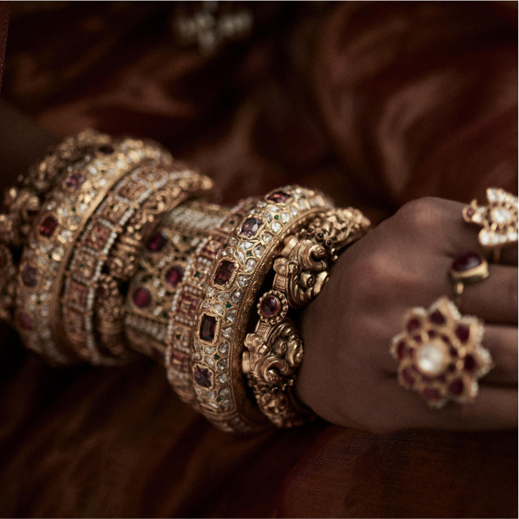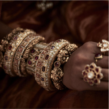 Nakashi is a centuries-old repousse technique, completely crafted by hand to create a beautiful engraved, three-dimensional effect in gold. A southern Indian craft, where a sheet of gold is worked with chisels from both sides to create incredible scenes. Sabyasachi curates a special collection of the finest of Temple and Nakashi jewellery in 22k gold.