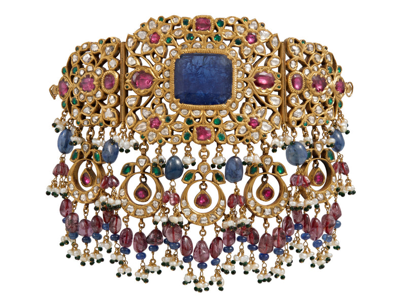 Sabyasachi reinterprets the royal jadau necklaces of India. These historic handcrafted necklaces adorned the ancient royals and aristocrats. The threaded rope clasp or ‘sarafa’ has been transformed into a broad sash in Sabyasachi’s iconic printed velvets. While a more contemporary frame layers together precious gemstones with handcrafted techniques and legacy crafts.