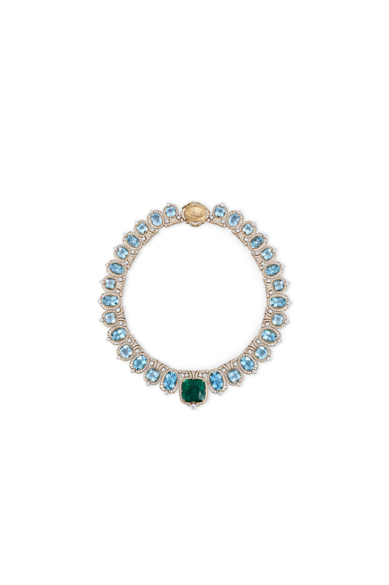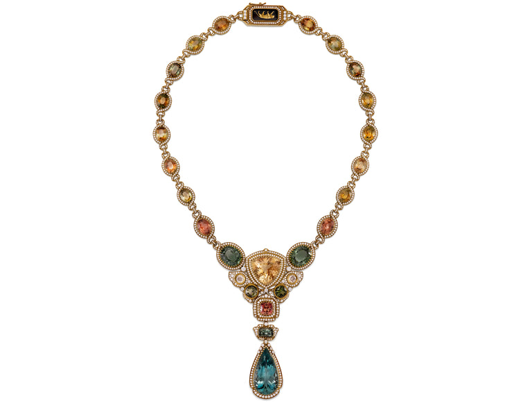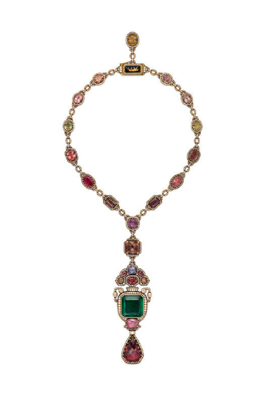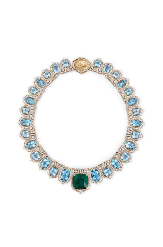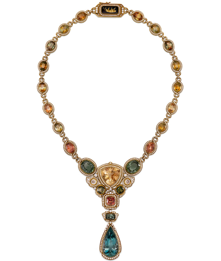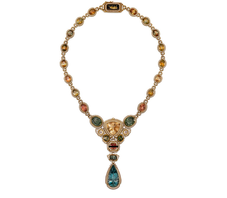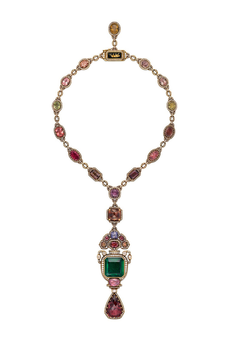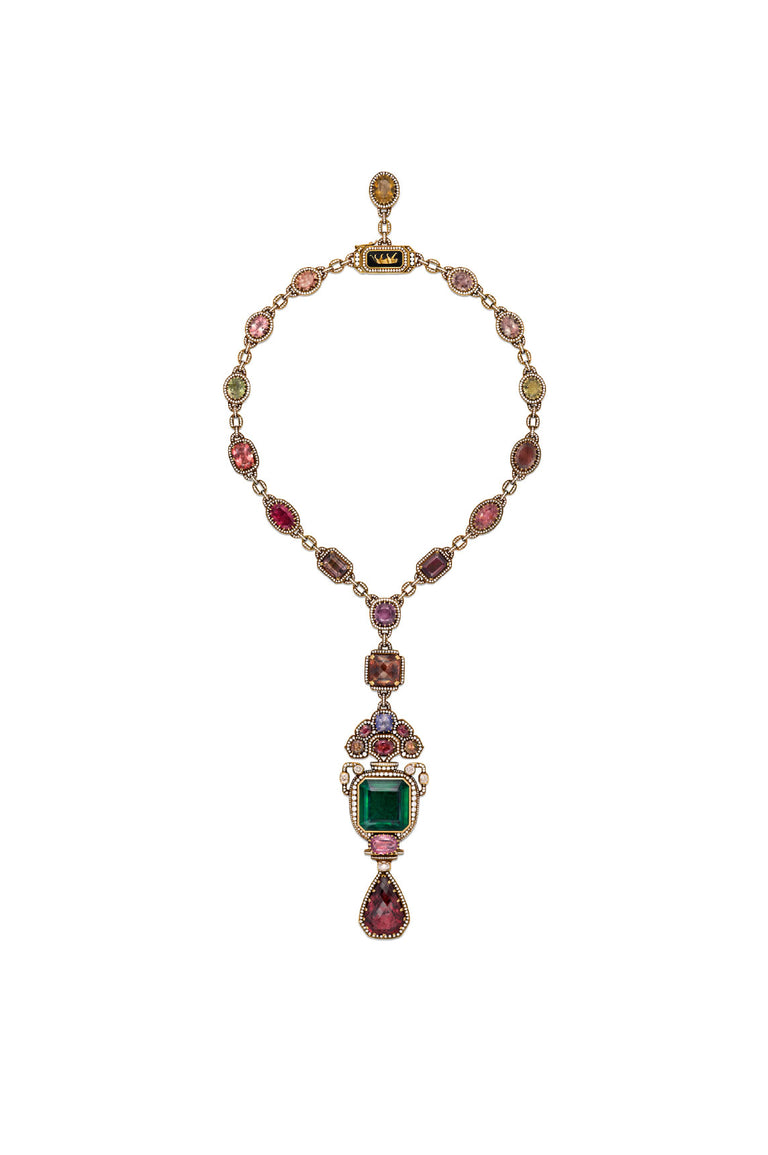 Necklace crafted in 18k gold with tourmaline, aquamarine, old mine cut and brilliant cut EF VVS VS diamonds.