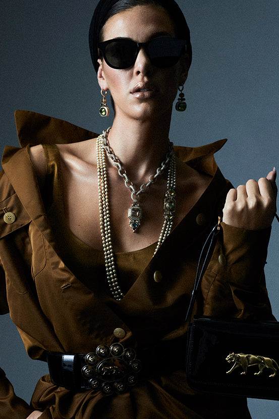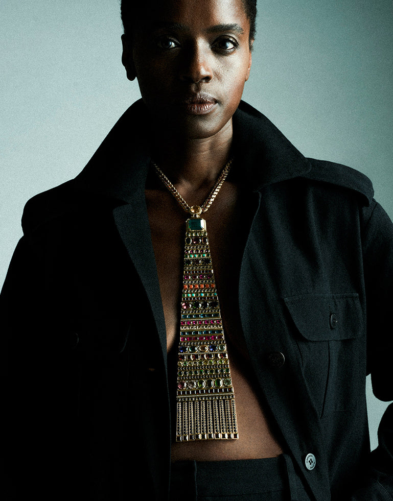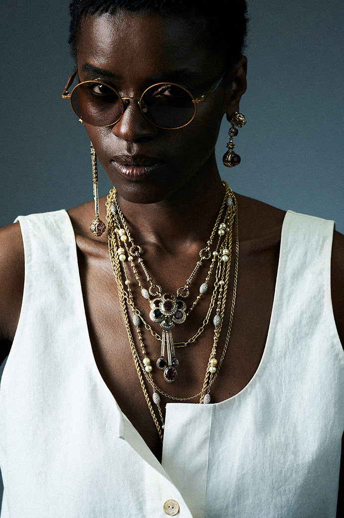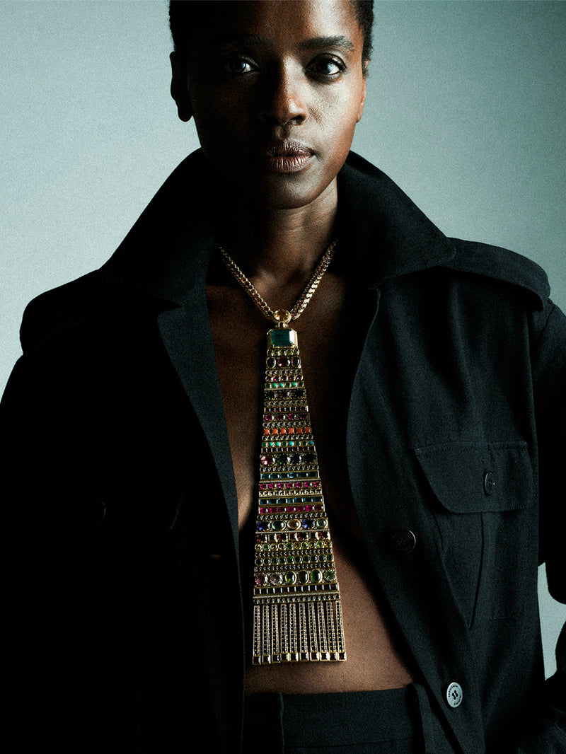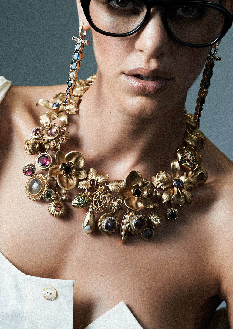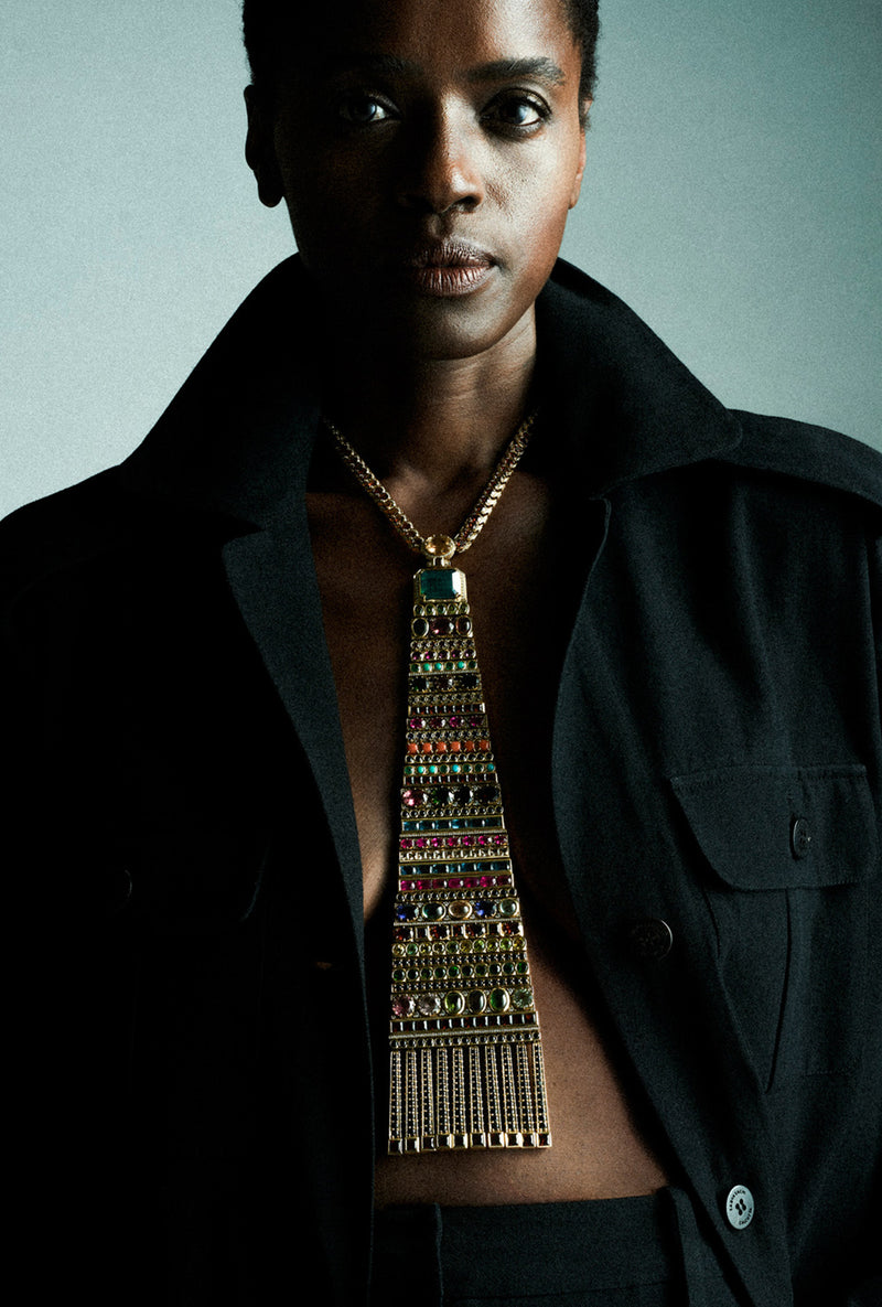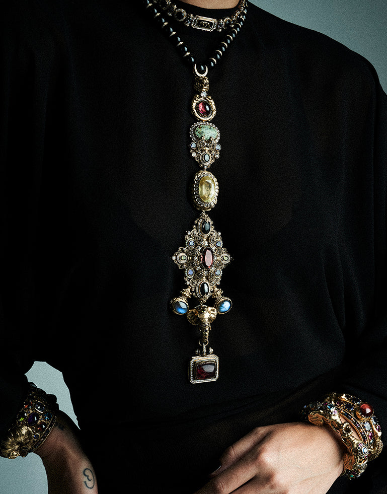 “I am currently fascinated by menswear tailoring for women and with Gustav Klimt’s Golden Phase. Long, Linear, Gilded and Deco. The classic tie but a mosaic of schizophrenic gemstones and lavish fringe. I think this is one of my most eclectic pieces to date.”