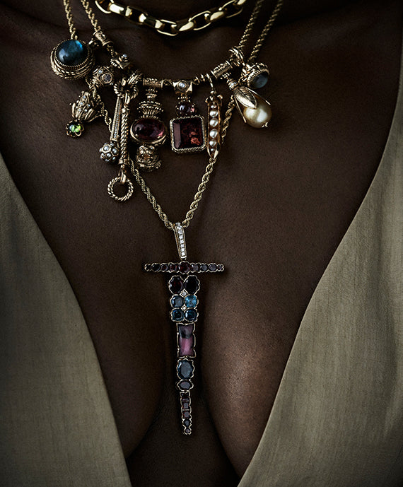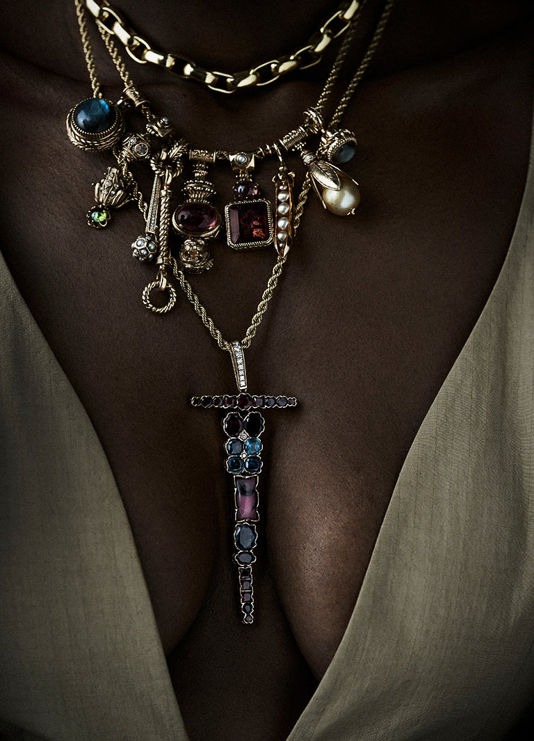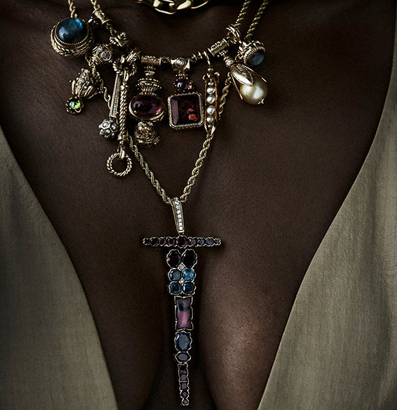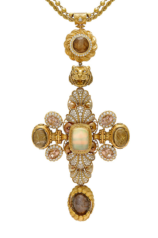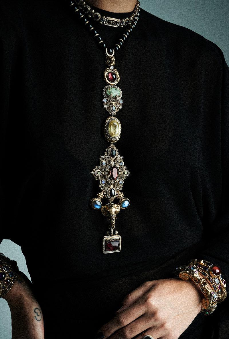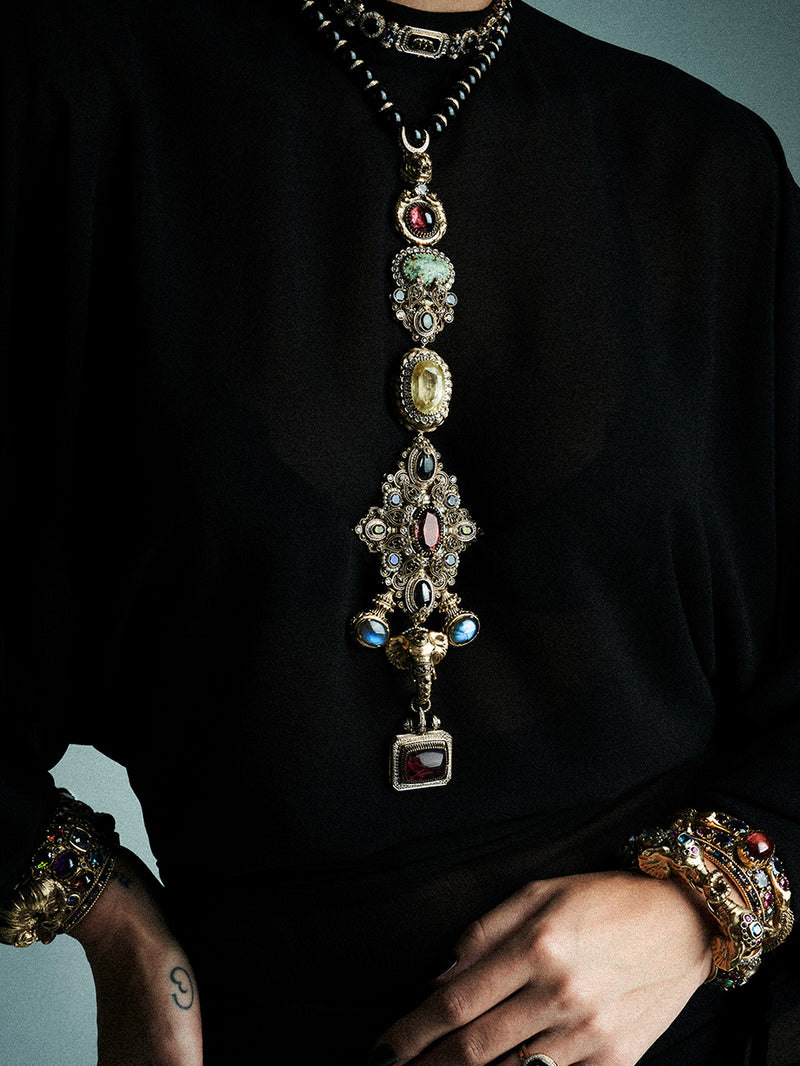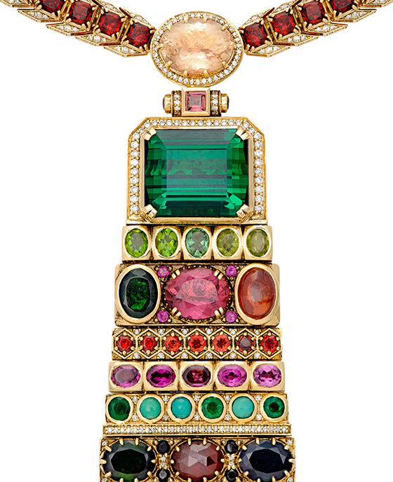Mixing the sacred and profane, multiple cultures and different genres of jewellery making—The Moulin Rouge necklace is a celebration of craftsmanship. Medieval, Byzantine, Georgian, Victorian, Italian and Bengal renaissance techniques come together to create an unusual statement.