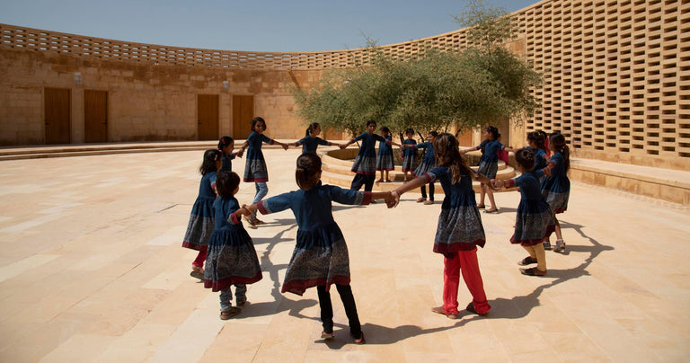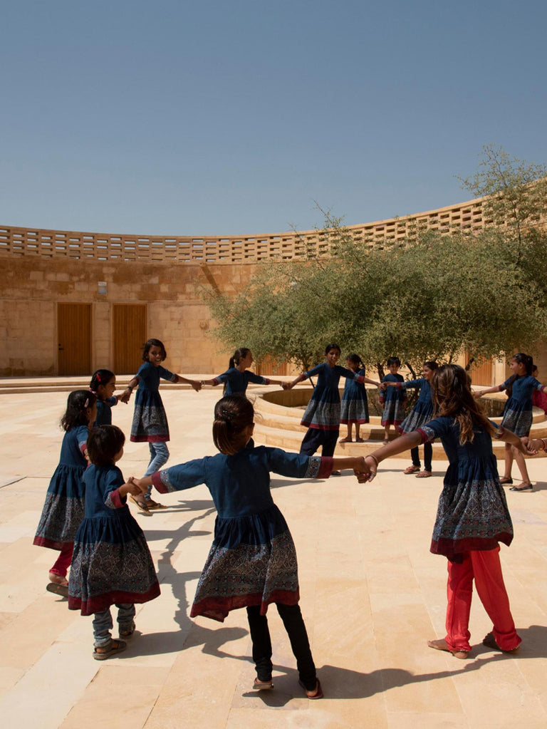 The Rajkumari Ratnavati Girls School in the Thar Desert of Jaisalmer in India is a unique initiative. The school accommodates 400 girls from play school to the tenth grade. It aims at providing them with an education alongside a training centre for traditional artisanal skills such as artistry, weaving and embroidery. A social initiative, the school was built by Diana Kellogg Architects in collaboration with Michael Daube’s CITTA, on donated land from Manvendra Singh Shekhawat. Sabyasachi designed the uniforms for the girls, using Ajrakh, a complex local craft of woodblock printing on cotton.