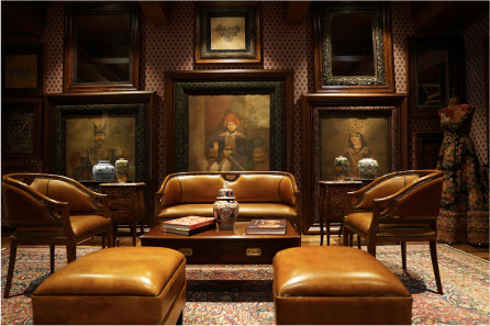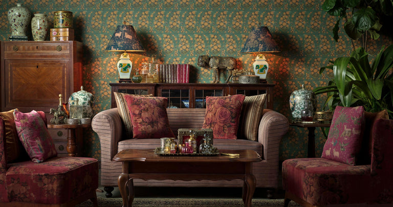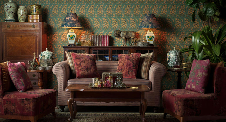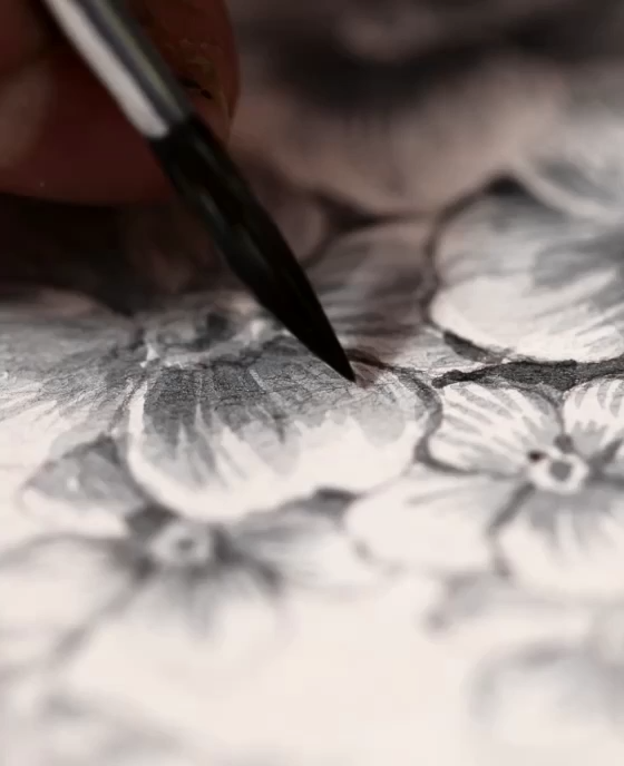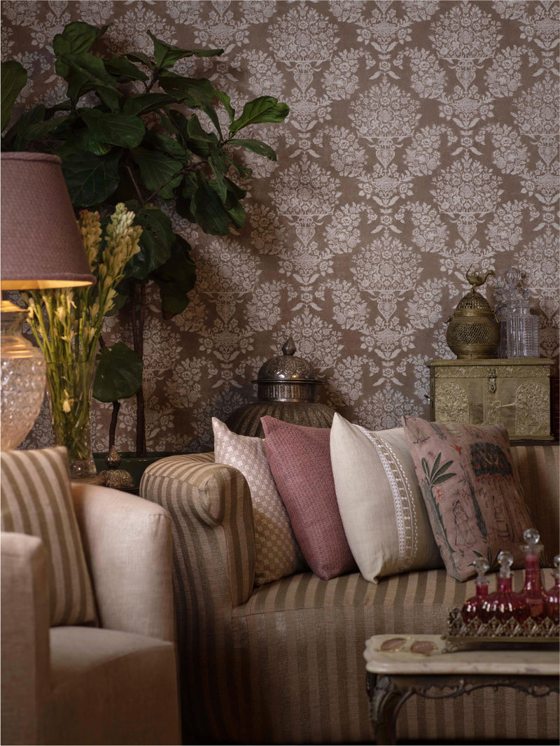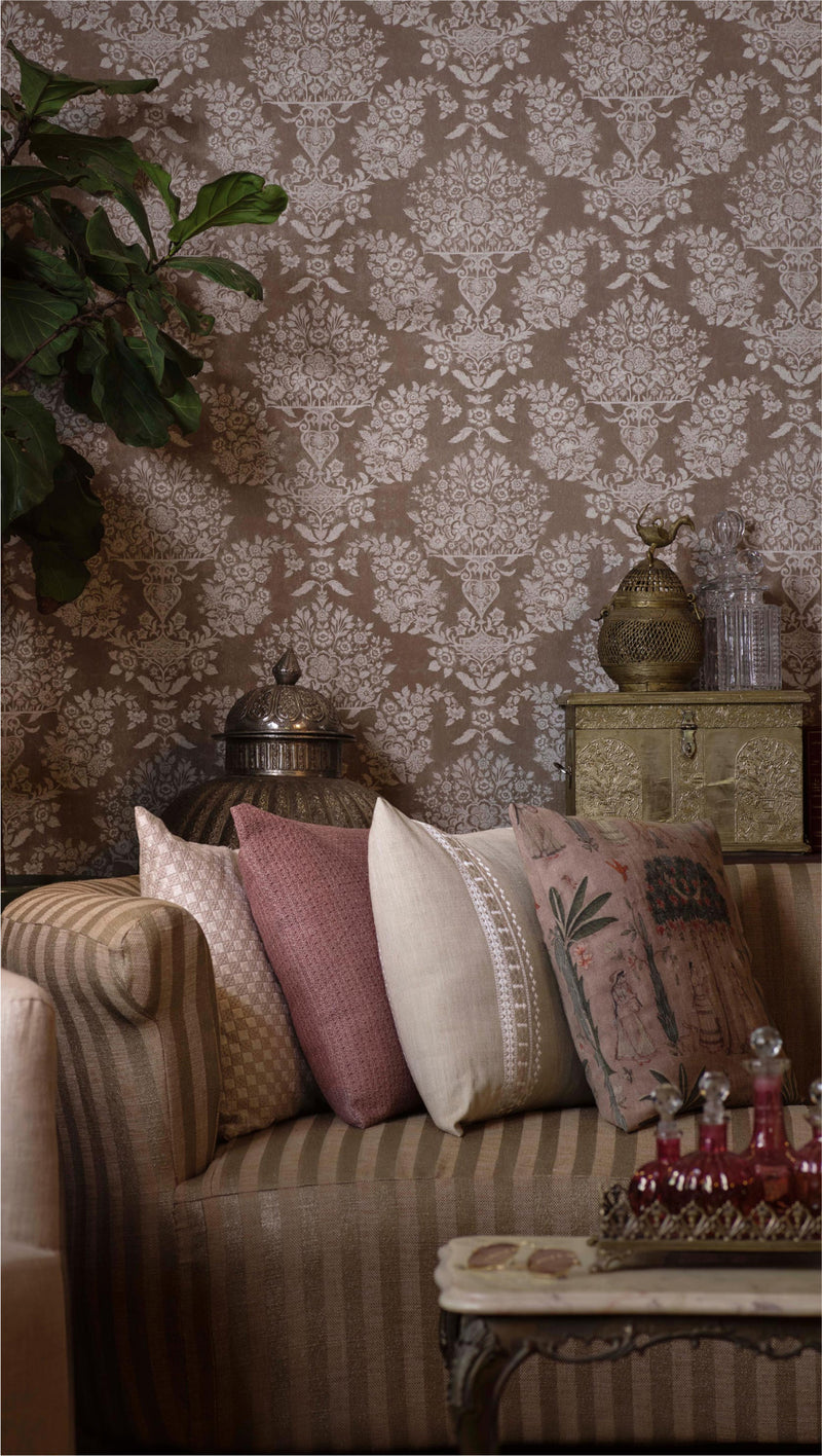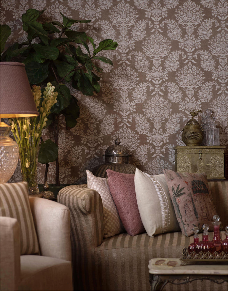 The Sabyasachi Art Foundation was commissioned by Sabyasachi to hand paint original prints that were then digitally rendered into upholsteries and wallpapers for the Sabyasachi for Nilaya by Asian Paints collection.