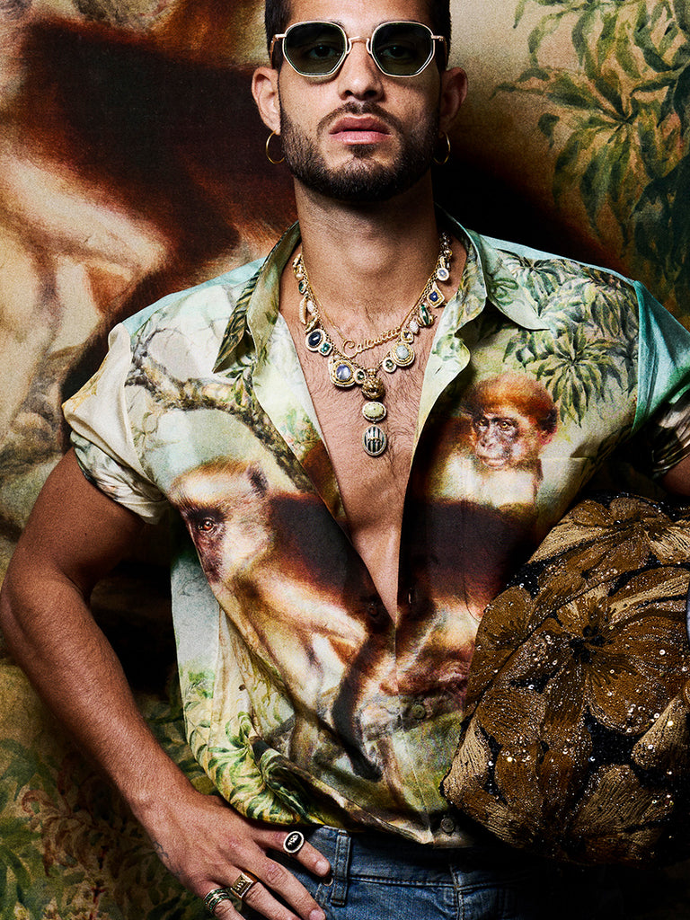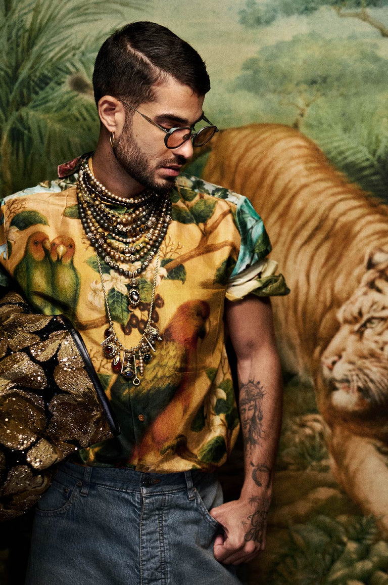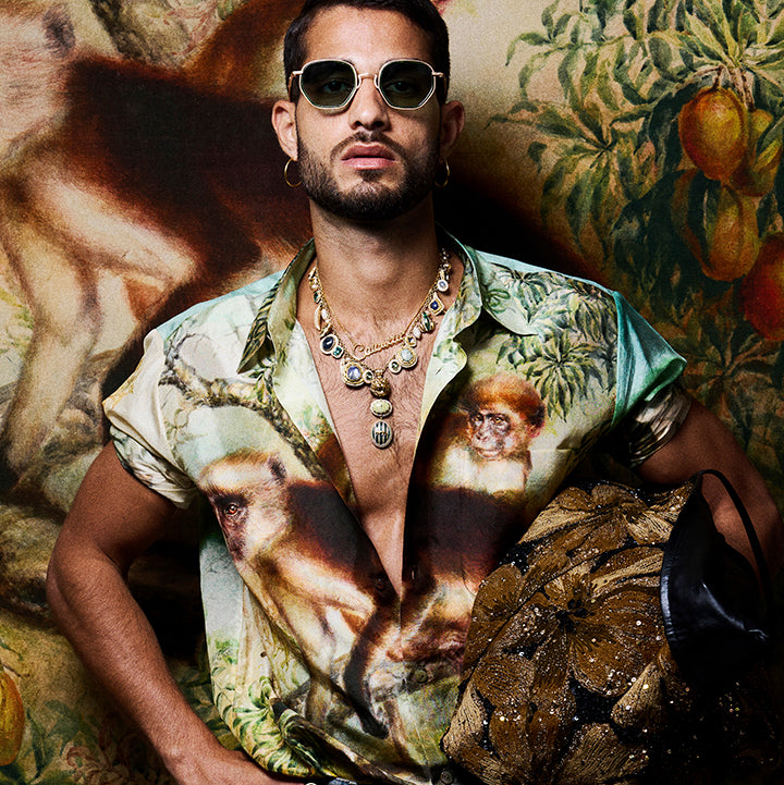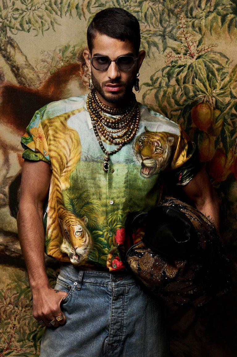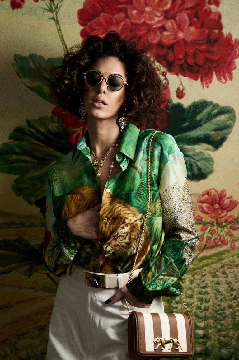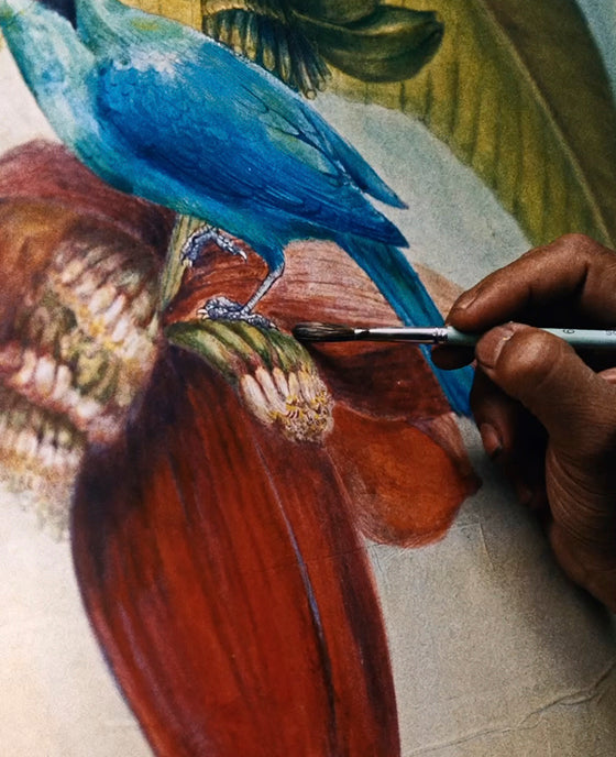 Featuring prints created by The Sabyasachi Art Foundation. The prints are digital renderings of original hand painted artwork using earth colours and the ancient tempera painting technique. The artwork is inspired by the wild plenitude of tropical flora and fauna, led by the house insignia, the majestic Royal Bengal Tiger.